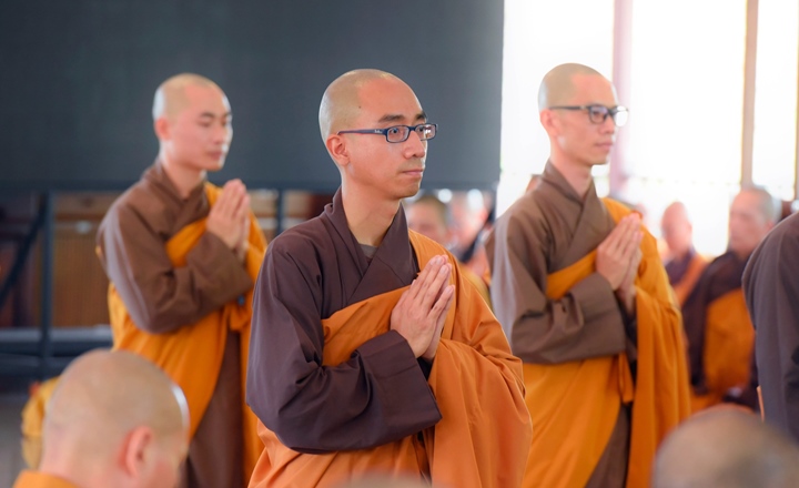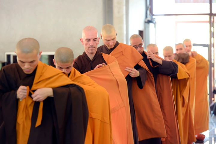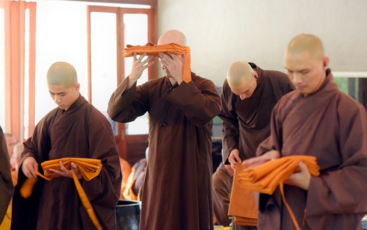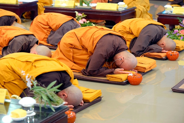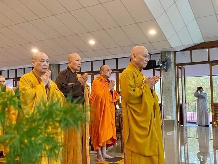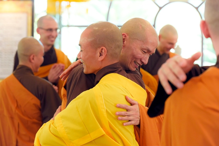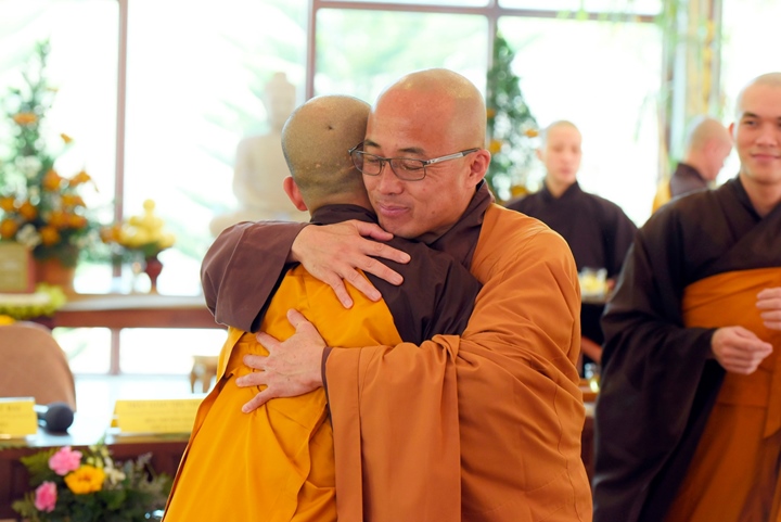 Viên mãn lễ truyền giới, thầy Chân Pháp Anh (trụ trì tu viện Vườn Ươm - Thái Lan và thầy Chân Pháp Hữu (trụ trì chùa Pháp Vân - Làng Mai Pháp cùng các giới tử đã làm lễ tạ giới sư.