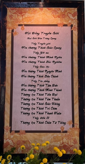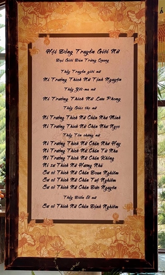 Hội đồng Truyền giới khất sĩ nữ cung thỉnh NT. Thích Nữ Thích Nữ Tịnh Nguyện (chùa Phước Hải TPHCM) làm thầy truyền giới Tỳ kheo ni; NT. Thích Nữ Lưu Phong (chùa Kiều Đàm TPHCM) làm thầy Yết ma, NT. TN Chân Như Minh và NS. TN Chân Như Ngọc làm thầy Giáo thọ; 7 vị tôn chứng cung thỉnh: NT. TN Chân Như Huy , NT. TN Chân Từ Nhu, NT. TN Chân Không, NS. TN Hương Nhũ, NS. TN Chân Đoan Nghiêm, SC. TN Chân Tuệ Nghiêm, SC. TN Chân Đức Nguyên, Ni sư Chân Định Nghiêm làm điển lễ.