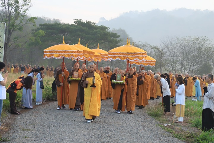 Vào lúc 06 giờ sáng ngày 10/2/2023, tứ chúng Đạo tràng Làng Mai từ các trung tâm thiền tập các nơi đã cung nghinh Hội đồng thập sư nhị bộ quang lâm đến Sân Trời để cung thỉnh Giới bổn Ba La Đề Mộc Xoa về Giới Trường Thiền Đường Voi Trắng.