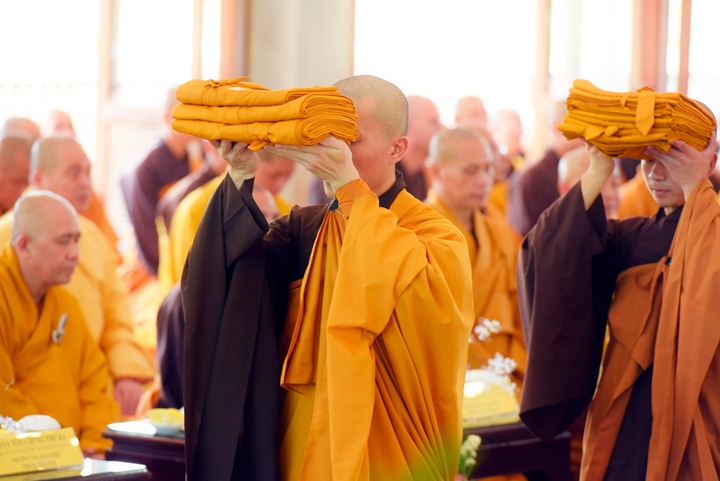 Sau khi các giới tử đã cầu thọ giới pháp, các thầy tôn chứng đã trực tiếp trao Y và Bát cho các giới tử trong khi chuông trống bát nhã vang lên đánh dấu khoảnh khắc các vị khất sĩ tân học được khoát lên mình tấm y giải thoát và bình bát- hai pháp khí gắn liền với cuộc đời của một khất sĩ.