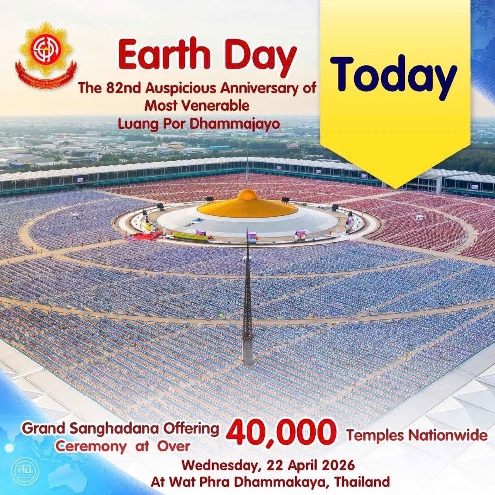 Ngày 22-4-2026, nhân dịp Ngày Trái Đất, tại Thiền viện Dhammakaya (Thái Lan) đã long trọng diễn ra Đại lễ cầu nguyện vì hòa bình và môi sinh toàn cầu, quy tụ quy mô đặc biệt lớn với gần 100.000 chư Tăng đến từ hơn 40.000 tự viện trên khắp đất nước Thái Lan và nhiều quốc gia như Việt Nam, Ấn Độ, Sri Lanka, Myanmar, Bangladesh, Trung Quốc, Lào, Campuchia, Malaysia…