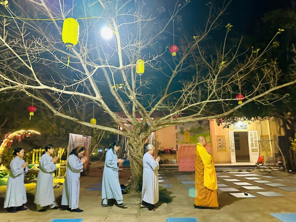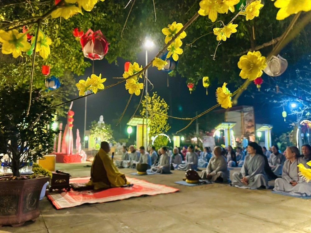 Tiếp đó, đại chúng thành kính dâng hương, đảnh lễ Tam Bảo, cùng nhau tọa thiền, thiền hành và dâng những đóa hoa tươi thắm lên tôn tượng Đức Phật Thích Ca nhân ngày thành đạo. Trong giây phút thiêng liêng ấy, thầy trò cùng nhau tịnh tọa bên Phật, ôn tụng kinh Chuyển Pháp Luân, niệm Phật và ôn lại Năm giới của người Phật tử tại gia, nhằm quán chiếu con đường tu tập mà Đức Phật đã chỉ dạy, giúp mỗi người chuyển hóa thân tâm, tìm thấy an vui trong hiện tại và hướng đến giải thoát trong tương lai.