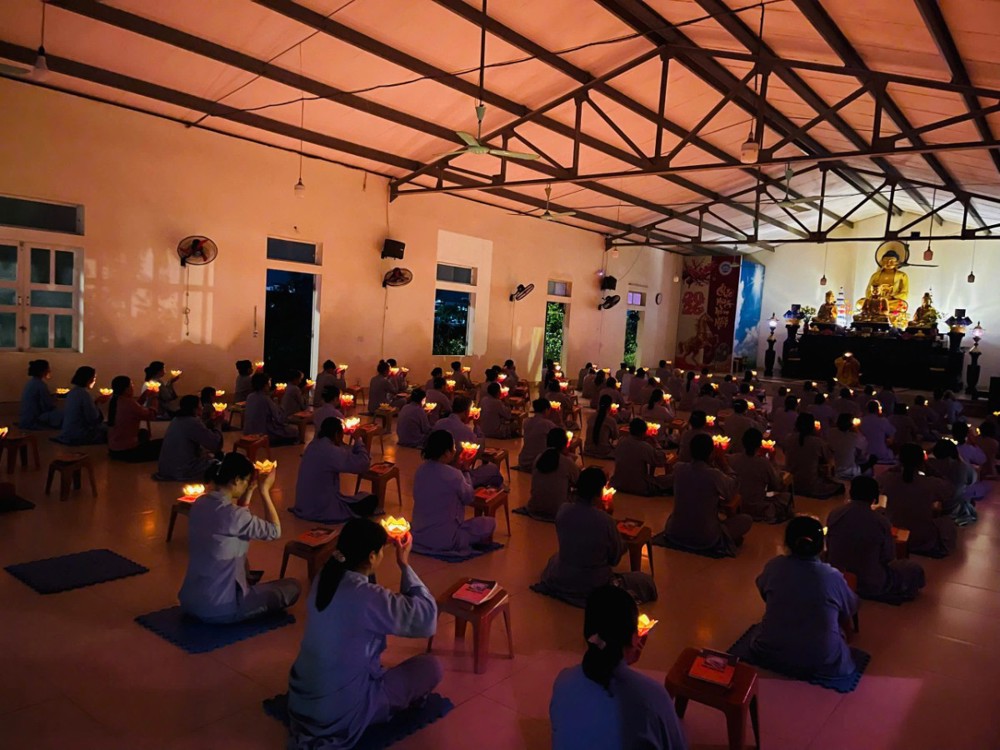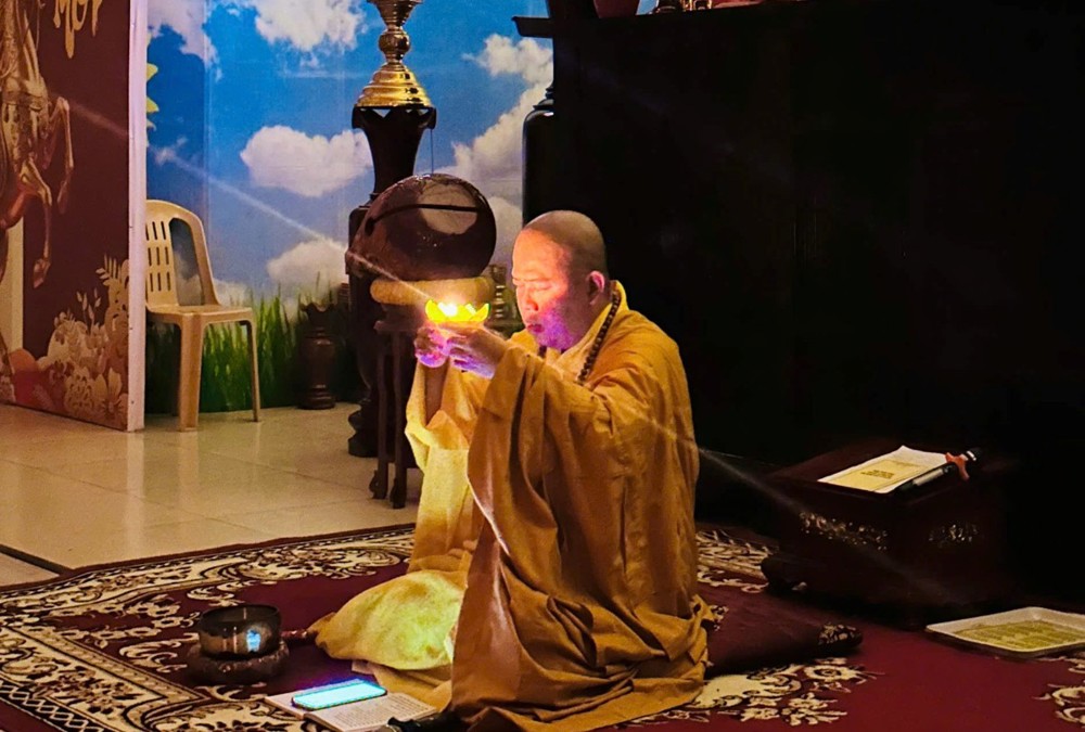 Sau phần ổn định đạo tràng, đại chúng đã cung thỉnh Đại đức Thích Tâm Hưng – trụ trì chùa quang lâm giảng đường Ngộ Chân Tử, hướng dẫn nghi lễ và chú nguyện. Với sự hướng dẫn tận tâm, bằng sở học và sự tu tập của mình, Đại đức đã cùng đại chúng tạo nên một đêm lễ trang nghiêm, giàu ý nghĩa tâm linh.