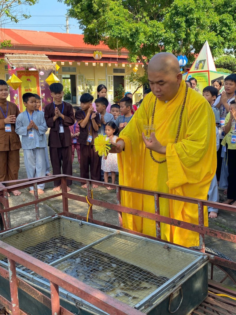 Các em cũng có cơ hội thăm phòng khách và nhận quà Trung Thu từ Thầy Trụ trì – như một món quà yêu thương, tiếp thêm niềm vui và động lực tu học. Trong không khí đầy hoan hỷ, các em được hướng dẫn tham gia phóng sinh, gieo duyên lành, học cách yêu thương và bảo vệ sự sống muôn loài.