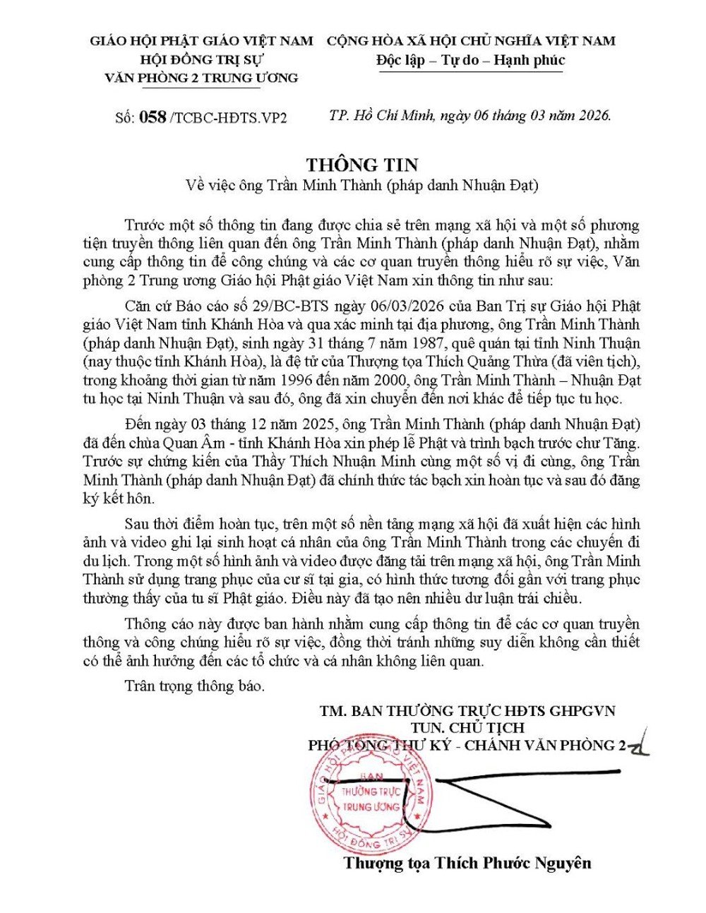 THÔNG TIN Trước một số thông tin đang được chia sẻ trên mạng xã hội và một số phương tiện truyền thông liên quan đến ông Trần Minh Thành (pháp danh Nhuận Đạt), nhằm cung cấp thông tin để công chúng và các cơ quan truyền thông hiểu rõ sự việc, Văn phòng 2 Trung ương Giáo hội Phật giáo Việt Nam xin thông tin như sau: Căn cứ Báo cáo số 29/BC-BTS ngày 06/03/2026 của Ban Trị sự Giáo hội Phật giáo Việt Nam tỉnh Khánh Hòa và qua xác minh tại địa phương, ông Trần Minh Thành (pháp danh Nhuận Đạt), sinh ngày 31 tháng 7 năm 1987, quê quán tại tỉnh Ninh Thuận (nay thuộc tỉnh Khánh Hòa), là đệ tử của Thượng tọa Thích Quảng Thừa (đã viên tịch), trong khoảng thời gian từ năm 1996 đến năm 2000, ông Trần Minh Thành - Nhuận Đạt tu học tại Ninh Thuận và sau đó, ông đã xin chuyển đến nơi khác để tiếp tục tu học. Đến ngày 03 tháng 12 năm 2025, ông Trần Minh Thành (pháp danh Nhuận Đạt) đã đến chùa Quan Âm - tỉnh Khánh Hòa xin phép lễ Phật và trình bạch trước chư Tăng. Trước sự chứng kiến của Thầy Thích Nhuận Minh cùng một số vị đi cùng, ông Trần Minh Thành (pháp danh Nhuận Đạt) đã chính thức tác bạch xin hoàn tục và sau đó đăng ký kết hôn. Sau thời điểm hoàn tục, trên một số nền tảng mạng xã hội đã xuất hiện các hình ảnh và video ghi lại sinh hoạt cá nhân của ông Trần Minh Thành trong các chuyến đi du lịch. Trong một số hình ảnh và video được đăng tải trên mạng xã hội, ông Trần Minh Thành sử dụng trang phục của cư sĩ tại gia, có hình thức tương đối gần với trang phục thường thấy của tu sĩ Phật giáo. Điều này đã tạo nên nhiều dư luận trái chiều. Thông cáo này được ban hành nhằm cung cấp thông tin để các cơ quan truyền thông và công chúng hiểu rõ sự việc, đồng thời tránh những suy diễn không cần thiết có thể ảnh hưởng đến các tổ chức và cá nhân không liên quan. Trân trọng thông báo. |