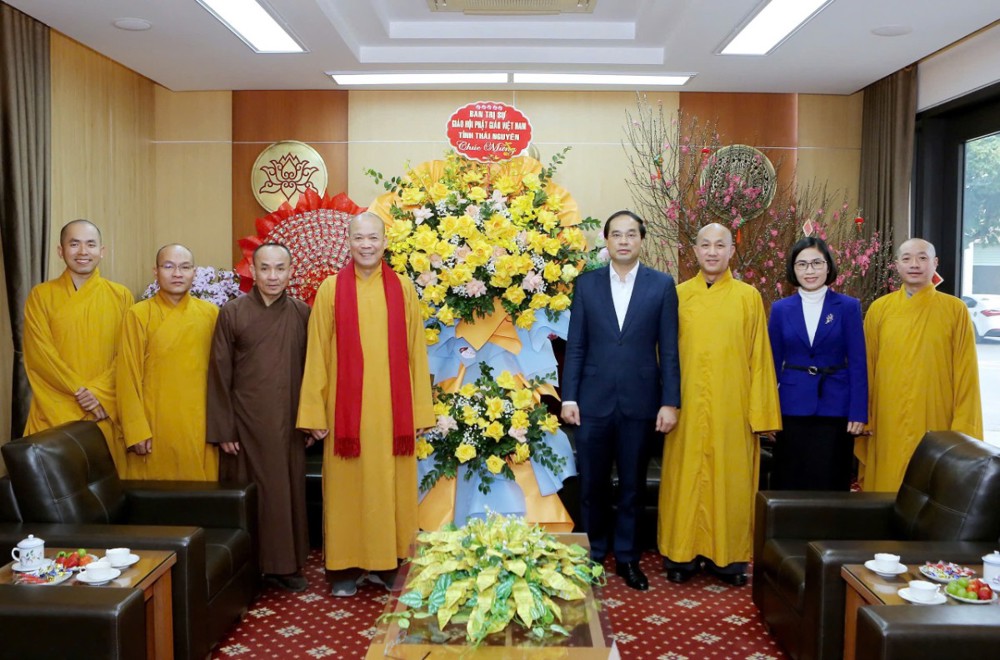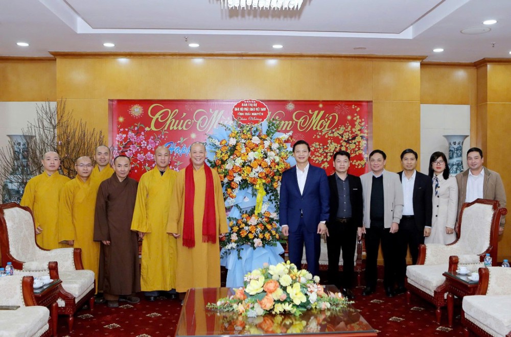 Tiếp đó, đoàn đã đến thăm và chúc Tết tại UBND tỉnh. Tại đây, ông Vương Quốc Tuấn, Ủy viên Ban Chấp hành Trung ương Đảng, Phó Bí thư Tỉnh ủy, Chủ tịch UBND tỉnh Thái Nguyên thân mật tiếp đoàn, gửi lời thăm hỏi và chúc mừng năm mới đến chư Tăng Ni, đồng bào Phật tử toàn tỉnh; đồng thời khái quát những kết quả nổi bật về kinh tế – xã hội của tỉnh trong thời gian qua, khẳng định vai trò tích cực của Phật giáo Thái Nguyên trong việc góp phần ổn định xã hội, phát triển văn hóa và xây dựng đời sống tinh thần của nhân dân.