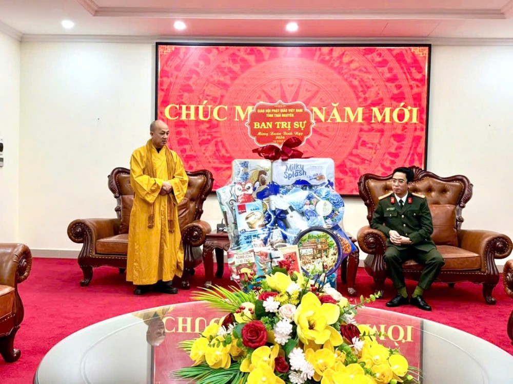 Trước đó, đoàn cũng đã đến thăm Sở Dân tộc và Tôn giáo tỉnh Thái Nguyên — cơ quan luôn đồng hành, hỗ trợ và tạo điều kiện thuận lợi cho các hoạt động Phật sự của Giáo hội địa phương. Cùng ngày, phái đoàn Thường trực Ban Trị sự GHPGVN tỉnh cũng đến thăm và chúc Tết lãnh đạo Công an tỉnh Thái Nguyên, gửi lời chúc sức khỏe và động viên cán bộ, chiến sĩ lực lượng Công an tiếp tục hoàn thành tốt nhiệm vụ bảo đảm an ninh trật tự, giữ gìn cuộc sống bình yên cho nhân dân.