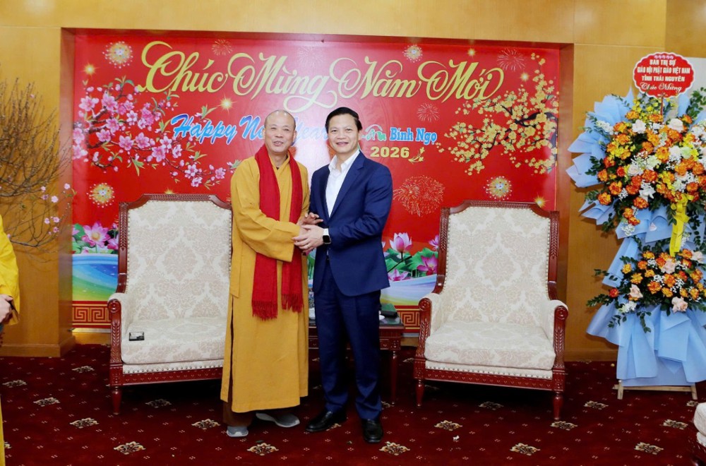 PSO - Chiều ngày 03/02/2026, nhân dịp Xuân Bính Ngọ 2026 và kỷ niệm 96 năm Ngày thành lập Đảng Cộng sản Việt Nam (03/02/1930 – 03/02/2026), Thường trực Ban Trị sự GHPGVN tỉnh Thái Nguyên đã tổ chức đoàn đến thăm và chúc Tết lãnh đạo Tỉnh ủy, HĐND, UBND tỉnh cùng các cơ quan chức năng trên địa bàn.