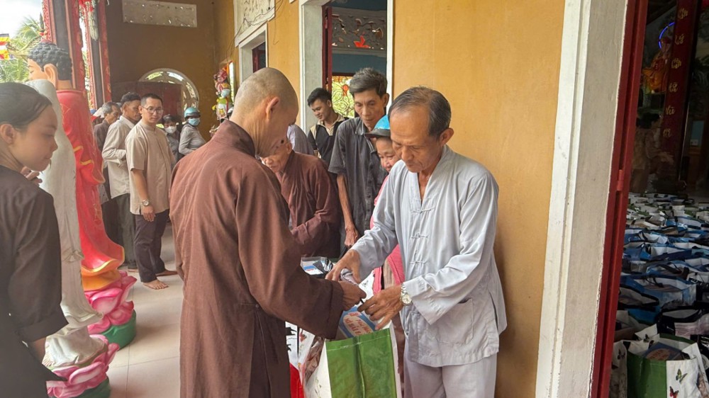 Cũng trong khuôn khổ buổi lễ, Thượng tọa Thích Minh Quang cùng quý Phật tử đến từ TP.HCM đã trao tặng 250 phần quà (gồm gạo, mì, đường, dầu ăn và tiền mặt) cho bà con có hoàn cảnh khó khăn tại địa phương, với tổng trị giá trên 75 triệu đồng.