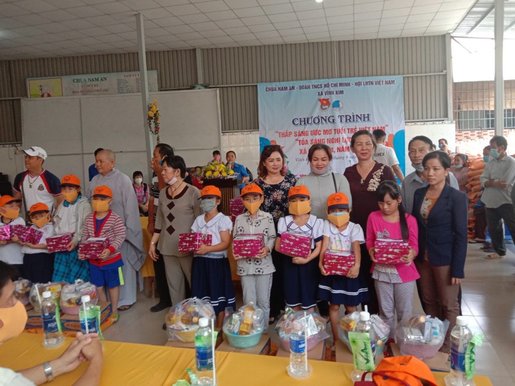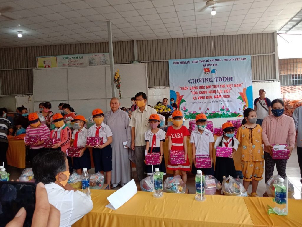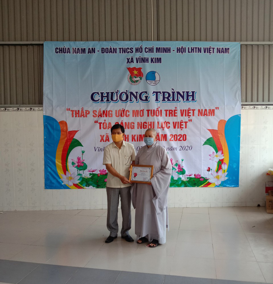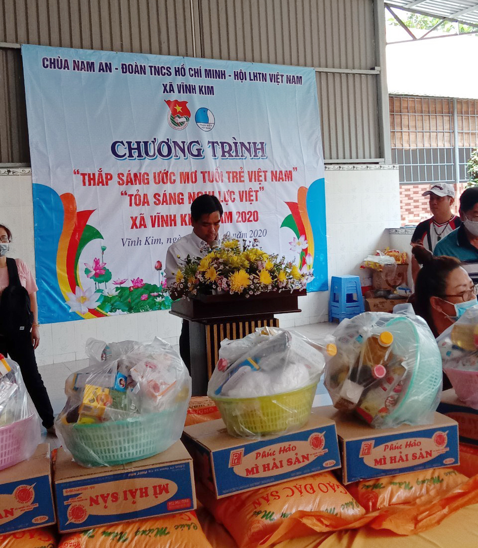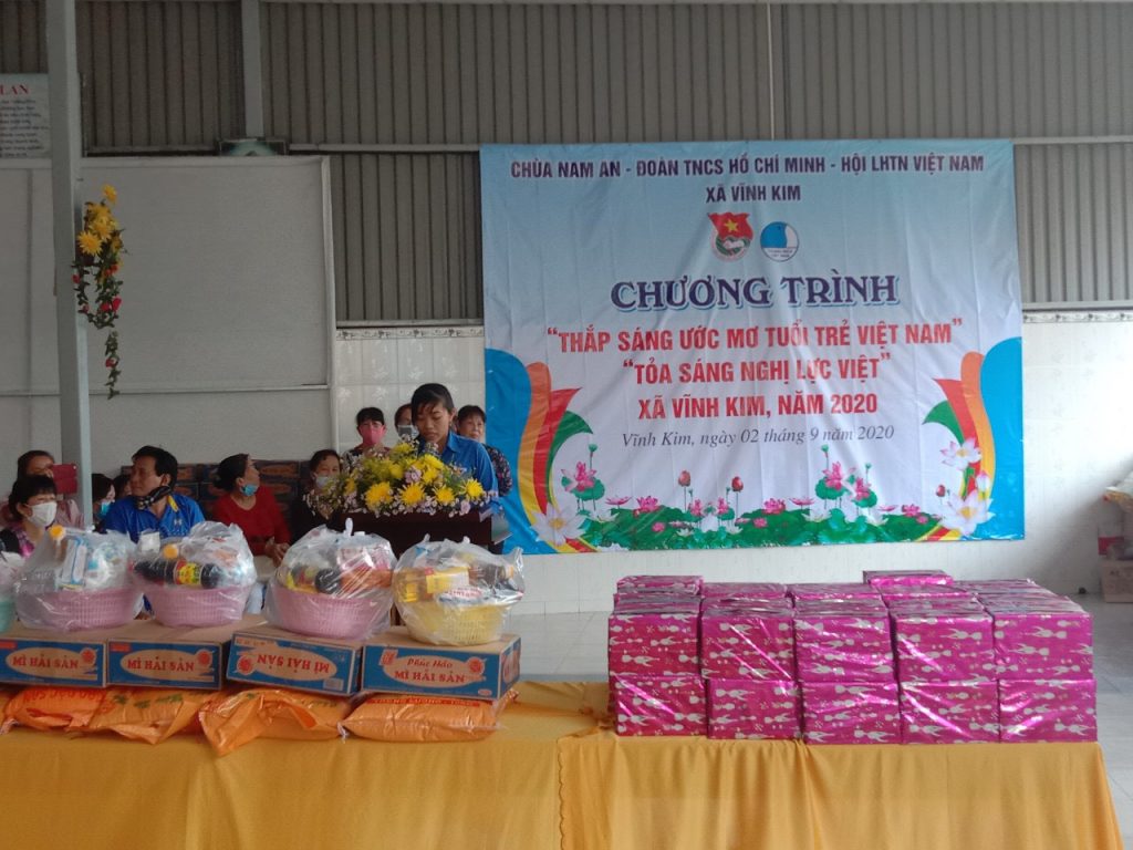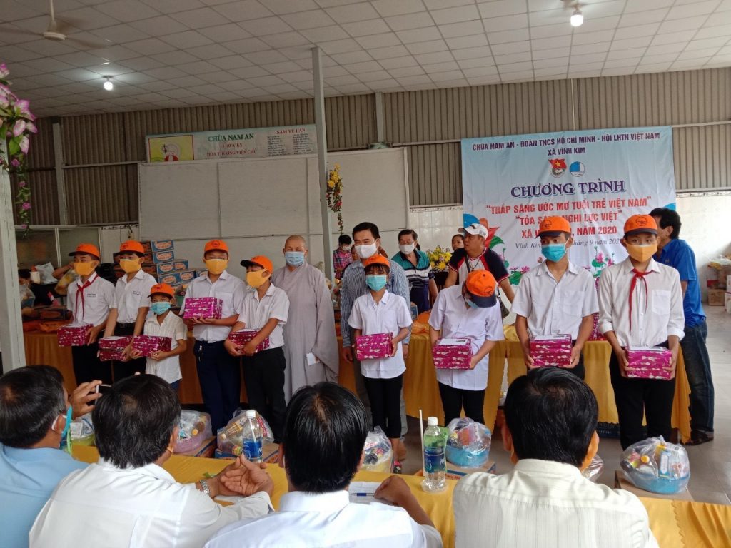 PSO – Ngày 02/9/2020 (nhằm ngày 15/7 năm Canh Tý), tại chùa Nam An (xã Vĩnh Kim, Châu Thành, Tiền Giang), Ni sư Trụ trì kết hợp với Đoàn Thanh niên Cộng sản Hồ Chí Minh và Hội Thanh niên Việt Nam xã Vĩnh Kim tổ chức chương trình “Thắp sáng ước mơ tuổi trẻ Việt”, trao tặng 40 phần quà đến các em học sinh; đồng thời trao tặng 160 phần quà cho bà con nghèo tại địa phương nhân mùa Vu lan Báo hiếu.