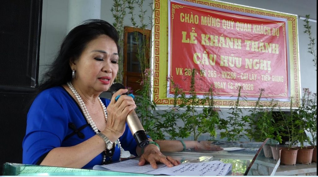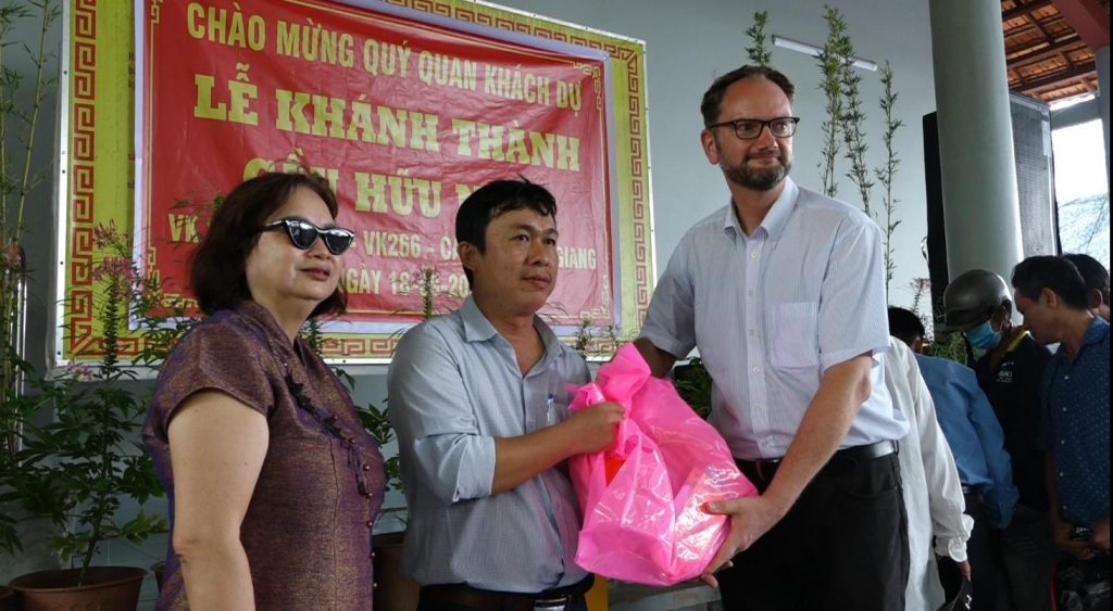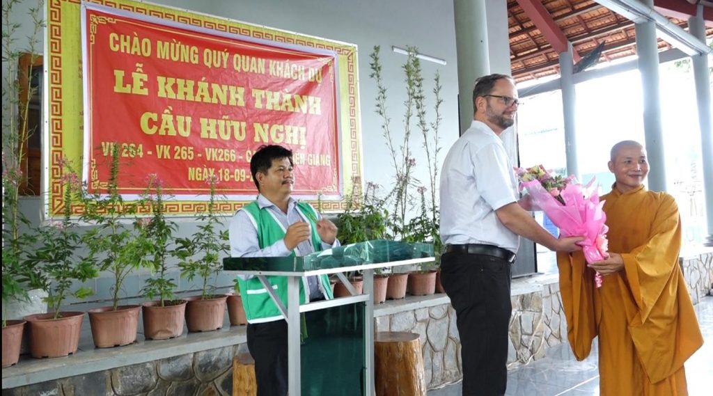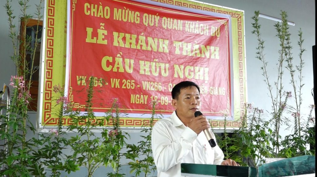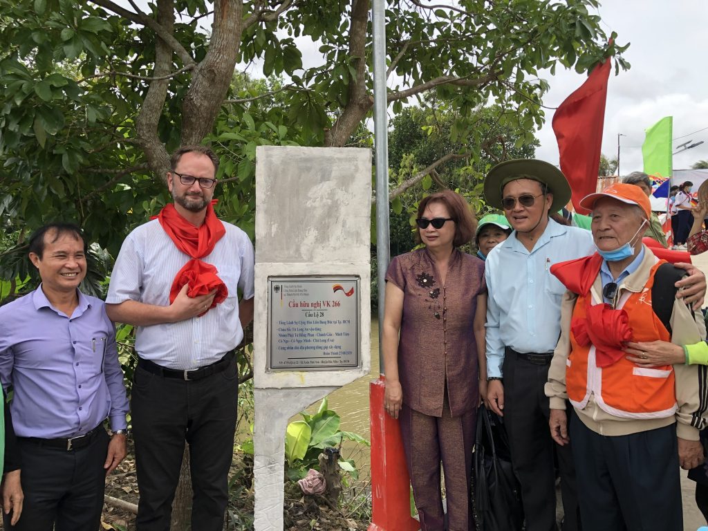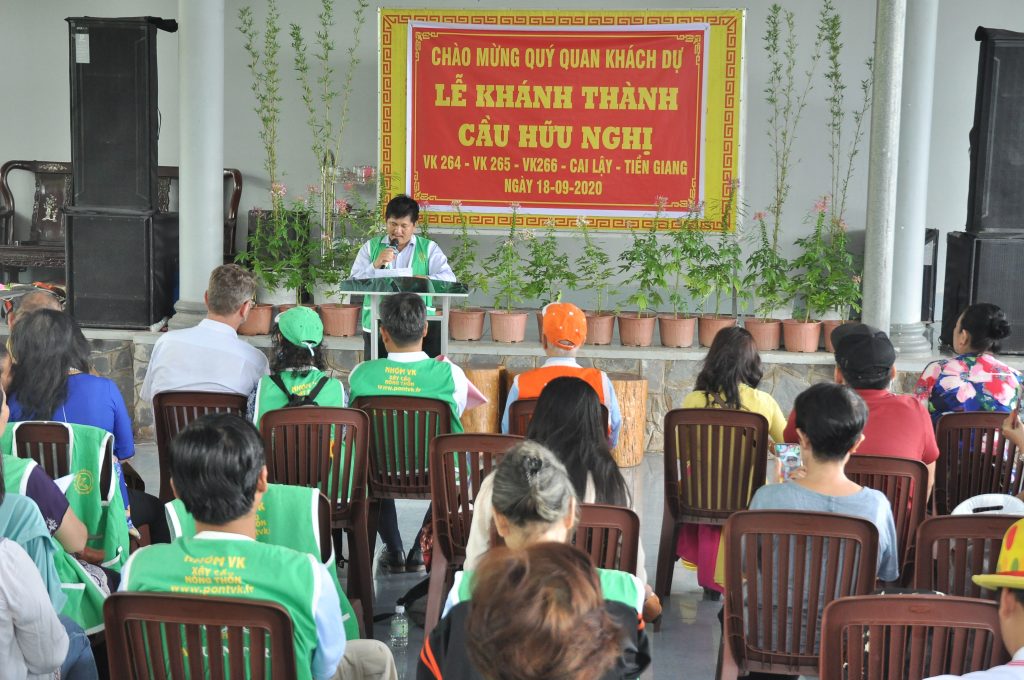 Tại buổi lễ, sau phần giới thiệu, ông Macro Merten - Lãnh sự Cộng hòa Liên Bang Đức tại TP.Hồ Chí Minh có lời phát biểu cùng với các nhà hảo tâm và bà con nhân dân, ông nêu lên tâm tư nguyện vọng được làm việc thiện nguyện để giúp đỡ người dân nông thôn Việt Nam, thời gian qua Ông cùng các thành viên “Nhóm VK Xây cầu Nông thôn” đã xây dựng các cây cầu rất ý nghĩa, mong rằng sắp tới sẽ cùng với nhóm xây thêm nhiều cây cầu hơn nữa, nhằm kết chặt mối tình hữu nghị giữa hai đất nước Việt – Đức.