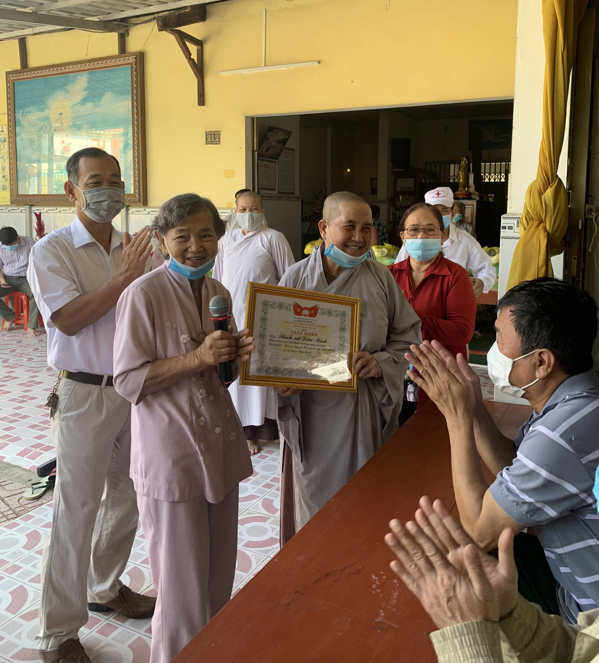 Để ghi nhận những đóng góp của Sư cô Thích Nữ Diệu Minh cho công tác từ thiện xã hội, dịp này UB MTTQVN huyện Châu Thành có Bằng Khen gửi tặng đến Sư cô. Chúc Sư cô luôn khỏe để dẫn dắt đạo tràng Phật tử tu học làm tốt đạo đẹp đời.