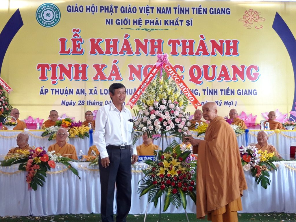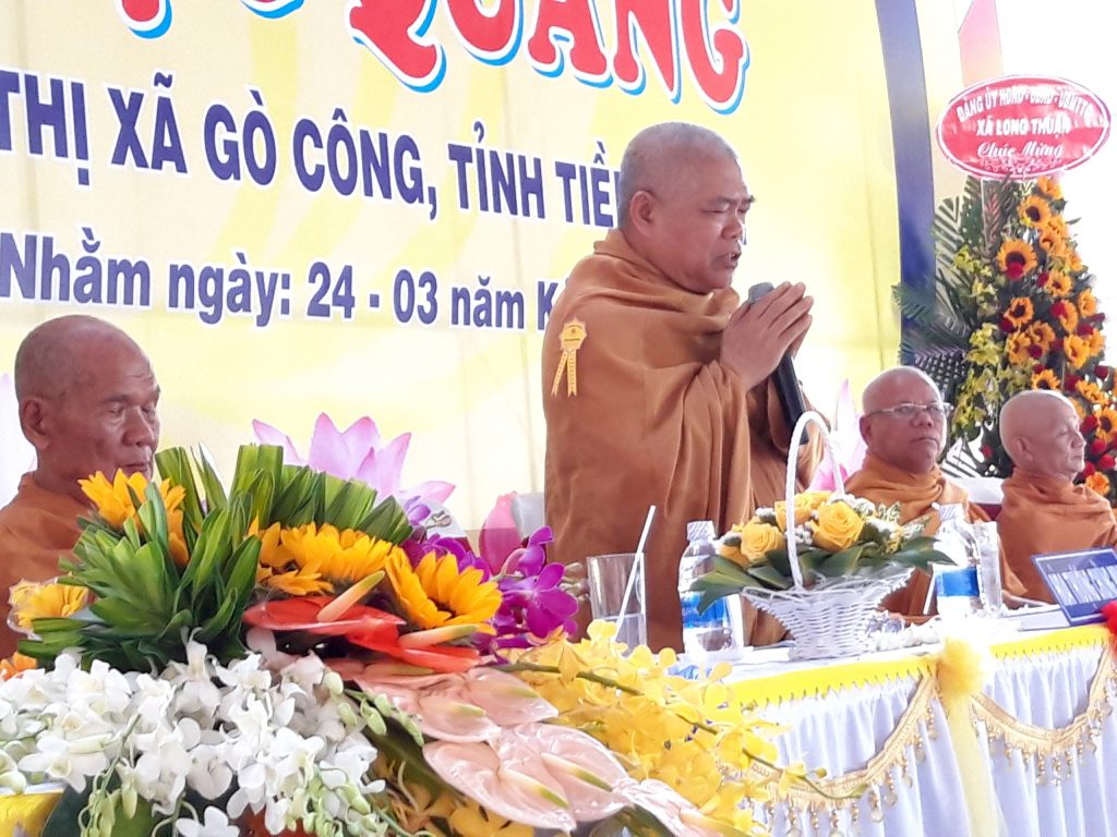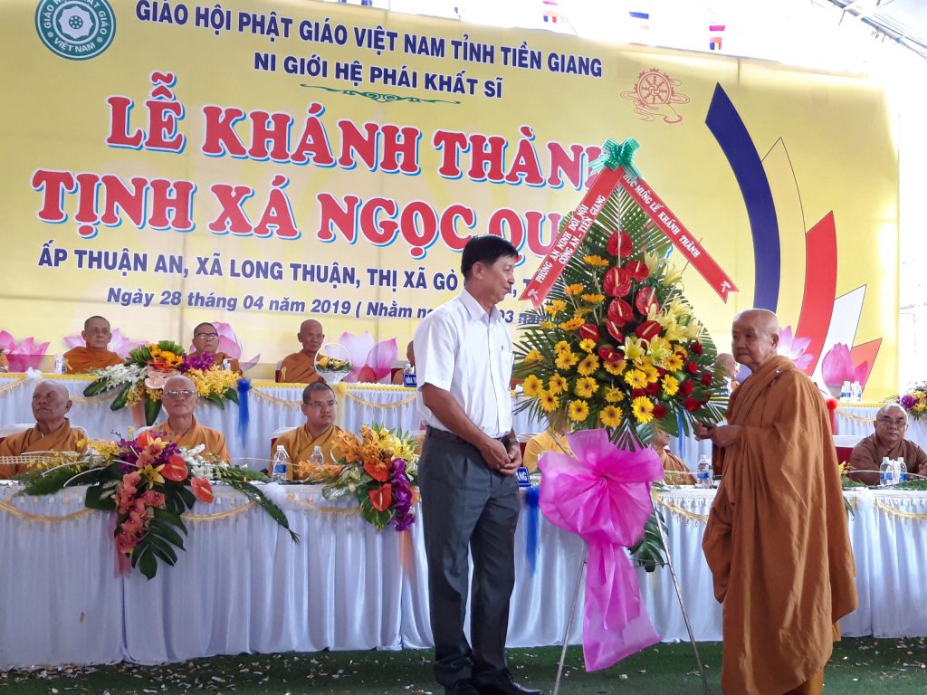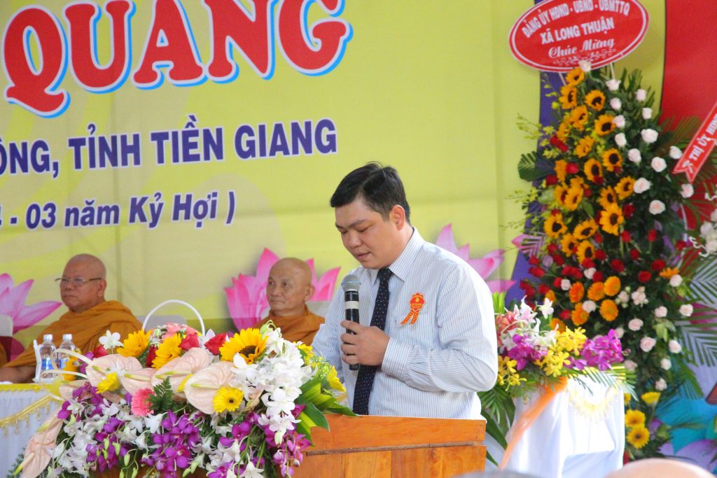 Đại diện lãnh đạo Chính quyền tham dự lễ, ông Trần Phạm Vĩnh An phát biểu: "Phật giáo Việt Nam từ khi thành lập cho đến nay, bất cứ thời kỳ nào, hoàn cảnh nào, Phật giáo đều đồng hành cùng dân tộc, góp phần to lớn trong công cuộc xây dựng, bảo vệ đất nước; Phật giáo TX. Gò Công là một phần của Phật giáo Việt Nam, thời gian qua Phật giáo thị xã góp phần to lớn trong công cuộc đền ơn đáp nghĩa, thực hiện công tác an sinh xã hội làm lợi ích cho đời. TX. Ngọc Quang cũng là nơi có nhiều đóng góp thiết thực cho công cuộc xây dựng Nông thôn mới, thị xã văn minh; Sự kiện Khánh thành hôm nay góp phần làm cho bộ mặt chung của xã Long Thuận và thị xã Gò Công ngày càng đổi mới tốt đẹp hơn. Thị ủy, UBND thị xã mong muốn chư Tăng Ni thị xã đoàn kết trong các công tác Phật sự cũng như góp phần xây dựng thị xã ngày càng phát triển, hướng tới xây dựng thị xã trở thành một Thành phố năng động vào thời gian tới, chúc buổi lễ thành công tốt đẹp".