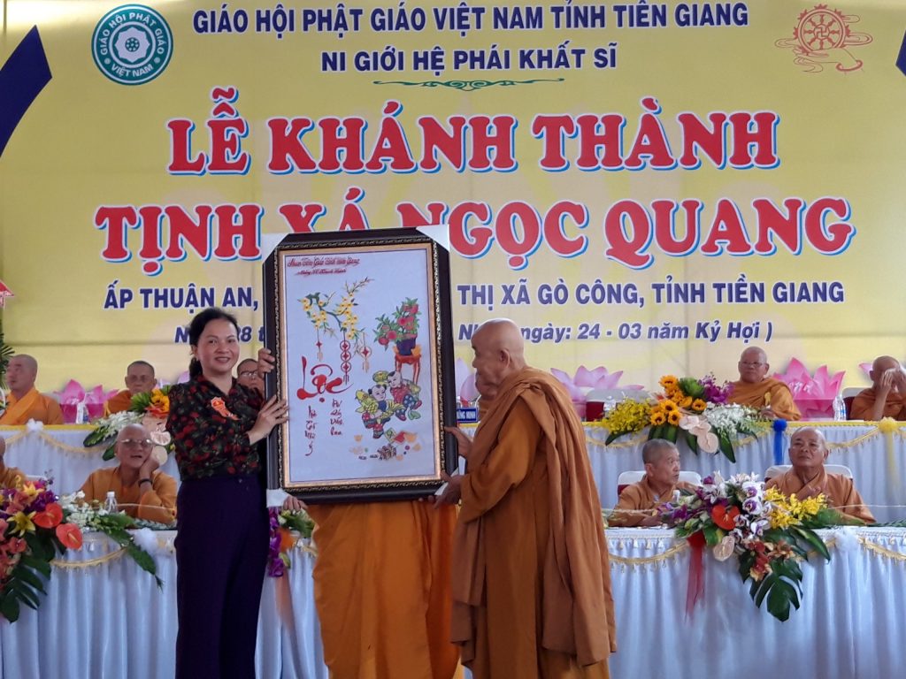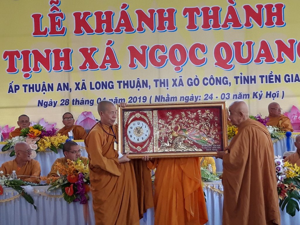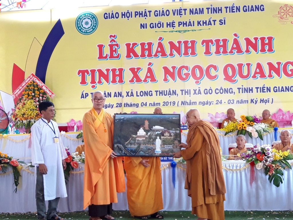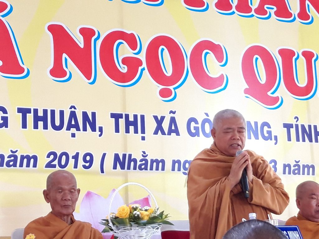 Đại diện lãnh đạo Chính quyền tham dự lễ, ông Trần Phạm Vĩnh An phát biểu: "Phật giáo Việt Nam từ khi thành lập cho đến nay, bất cứ thời kỳ nào, hoàn cảnh nào, Phật giáo đều đồng hành cùng dân tộc, góp phần to lớn trong công cuộc xây dựng, bảo vệ đất nước; Phật giáo TX. Gò Công là một phần của Phật giáo Việt Nam, thời gian qua Phật giáo thị xã góp phần to lớn trong công cuộc đền ơn đáp nghĩa, thực hiện công tác an sinh xã hội làm lợi ích cho đời. TX. Ngọc Quang cũng là nơi có nhiều đóng góp thiết thực cho công cuộc xây dựng Nông thôn mới, thị xã văn minh; Sự kiện Khánh thành hôm nay góp phần làm cho bộ mặt chung của xã Long Thuận và thị xã Gò Công ngày càng đổi mới tốt đẹp hơn. Thị ủy, UBND thị xã mong muốn chư Tăng Ni thị xã đoàn kết trong các công tác Phật sự cũng như góp phần xây dựng thị xã ngày càng phát triển, hướng tới xây dựng thị xã trở thành một Thành phố năng động vào thời gian tới, chúc buổi lễ thành công tốt đẹp".