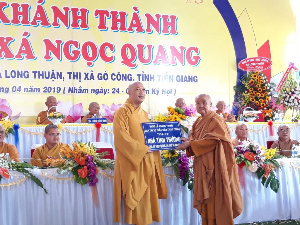Về tham dự Lễ, chư Tôn đức Tăng Ni, quý quan khách và Phật tử còn có nhiều phần quà gửi chúc mừng đến NT. Tân Liên với tâm nguyện chúc cho Phật sự tại Tịnh xá ngày càng phát triển vững mạnh. Nhân dịp này, Ban tổ chức đã gửi tặng 1 căn nhà tình thương trị giá 30 triệu đồng đến BTS Phật giáo thị xã để BTS liên lạc xây dựng cho những hộ gia đình tại địa phương cần được giúp đỡ. Hòa cùng niềm vui chung của Phật giáo cả nước hướng về ngày Đại lễ Phật đản Liên hợp quốc Vesak 2019, tịnh xá Ngọc Quang cũng sẽ gửi tặng 200 phần quà đến bà con có hoàn cảnh khó khăn vào buổi chiều cùng ngày.