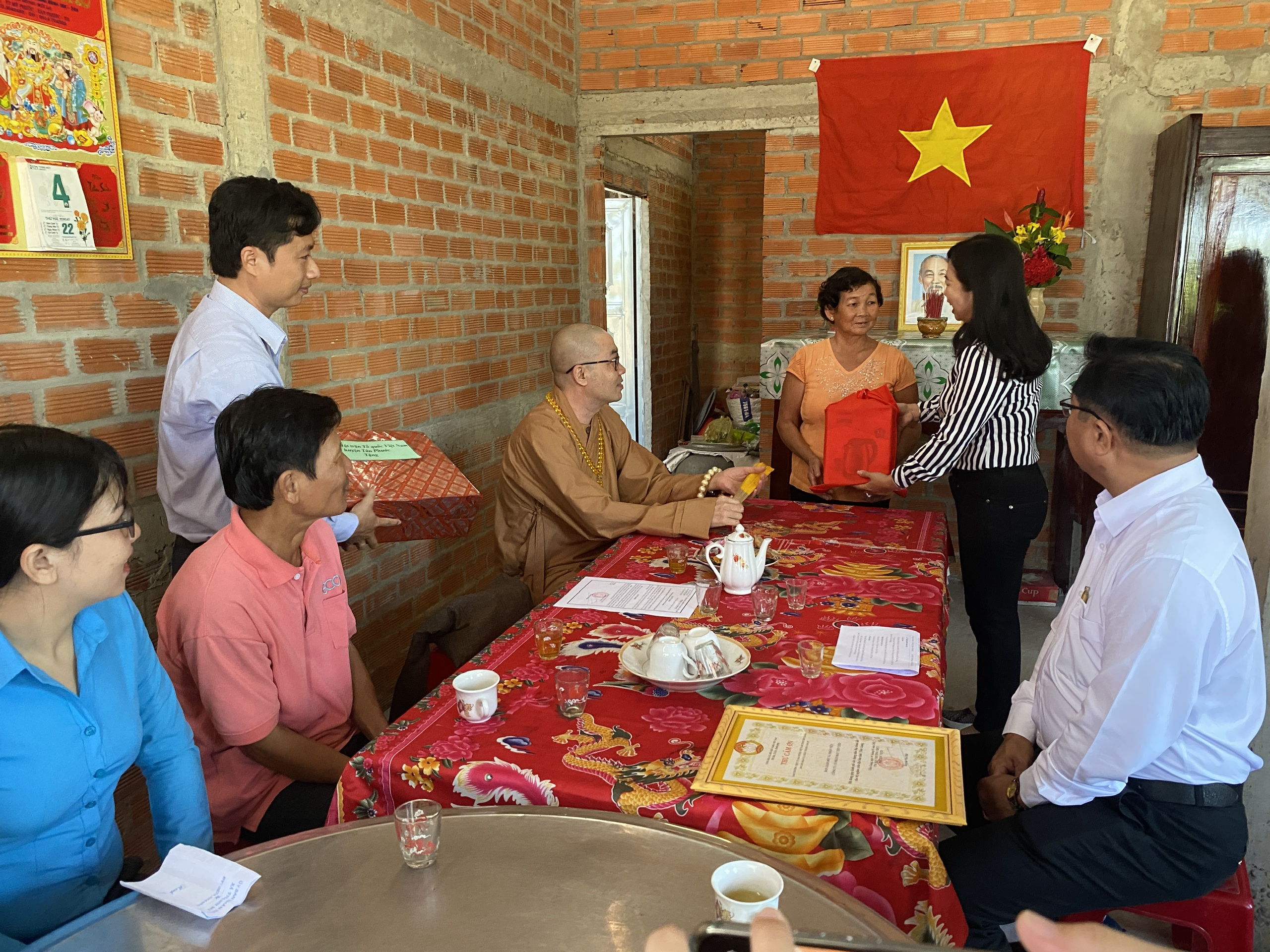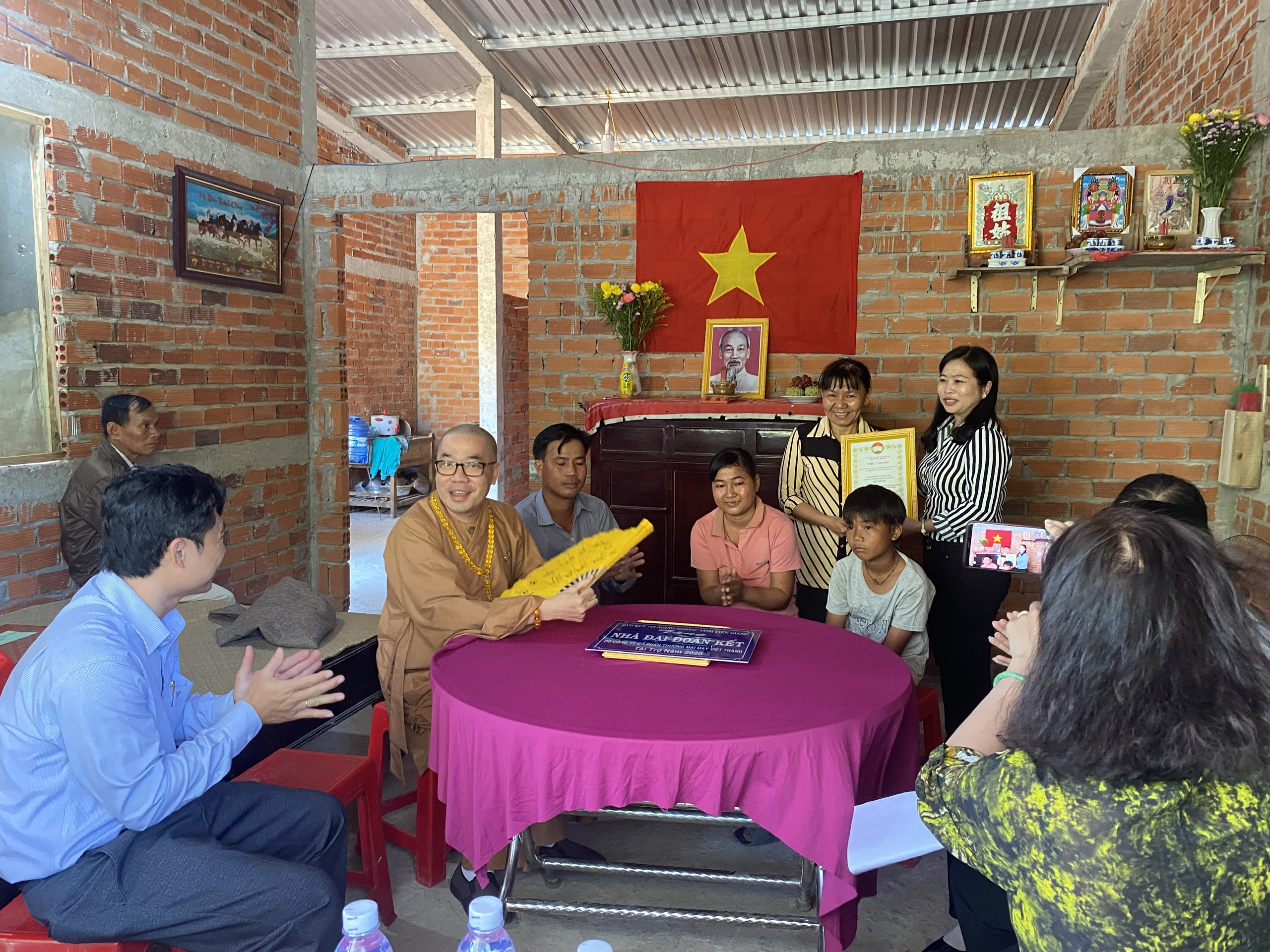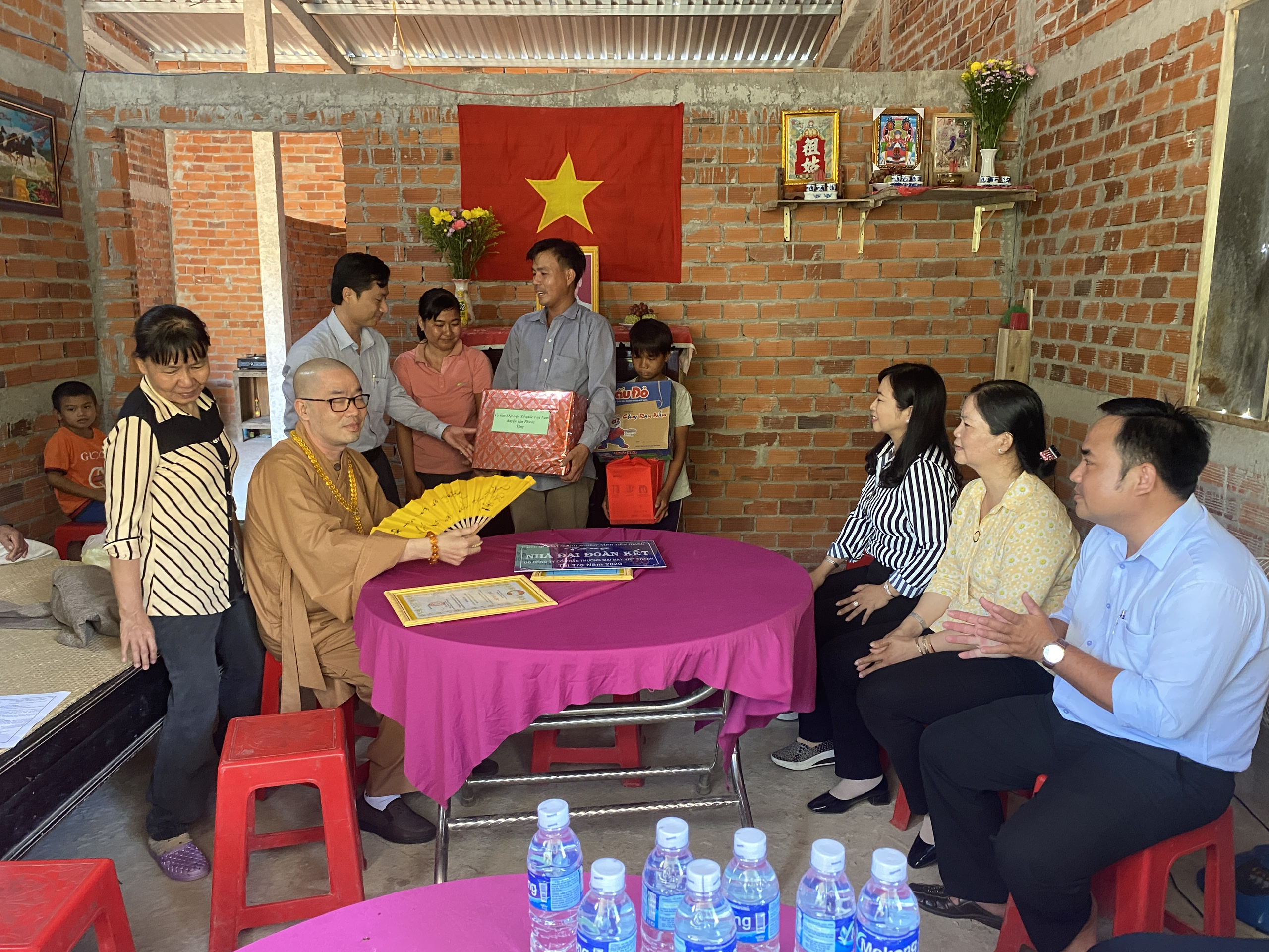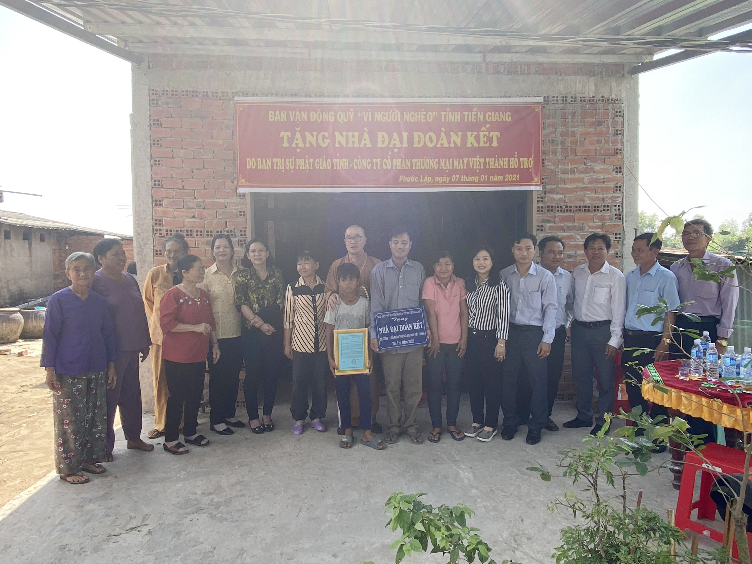 Buổi lễ bàn giao hai căn nhà có sự tham dự của TT.Thích Quảng Lộc – Phó BTS GHPGVN tỉnh Tiền Giang, Trưởng ban Từ thiện Xã hội Phật giáo tỉnh; bà Lê Thị Trang – UV Thường trực, Trưởng ban Phong trào Tôn giáo Dân tộc UB MTTQVN tỉnh; ông Phùng Văn Luân – Huyện ủy viên, Phó Chủ tịch UB MTTQVN huyện Tân Phước; ông Nguyễn Văn Thanh – Phó Bí thư xã Thạnh Mỹ; bà Lê Thị Bé Tiền – Phó Chủ tịch UBND xã Thạnh Mỹ; bà Phan Thị Diễm – Huyện ủy viên, Bí thư Đảng ủy xã Phước Lập; ông Nguyễn Hòa Anh – Phó Chủ tịch UBND xã Phước Lập; ông Hồ Thanh Khoa – Chủ tịch MTTQVN xã Phước Lập; bà Huỳnh Thị Thủy – Phó Giám đốc Cty May Tiền Tiến; bà Nguyễn Thị Sen – Phó GĐ Cty May Việt Thành; đại diện lãnh đạo các ấp sở tại và bà con địa phương với hai gia đình đồng tham dự.