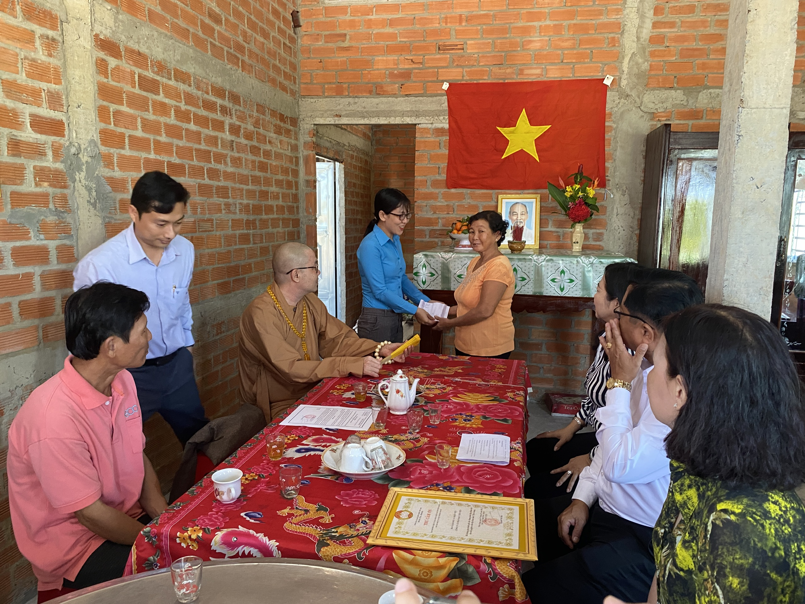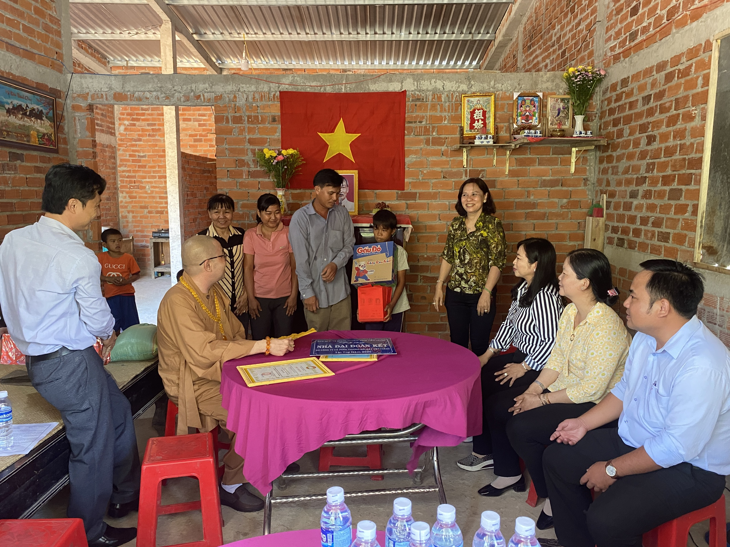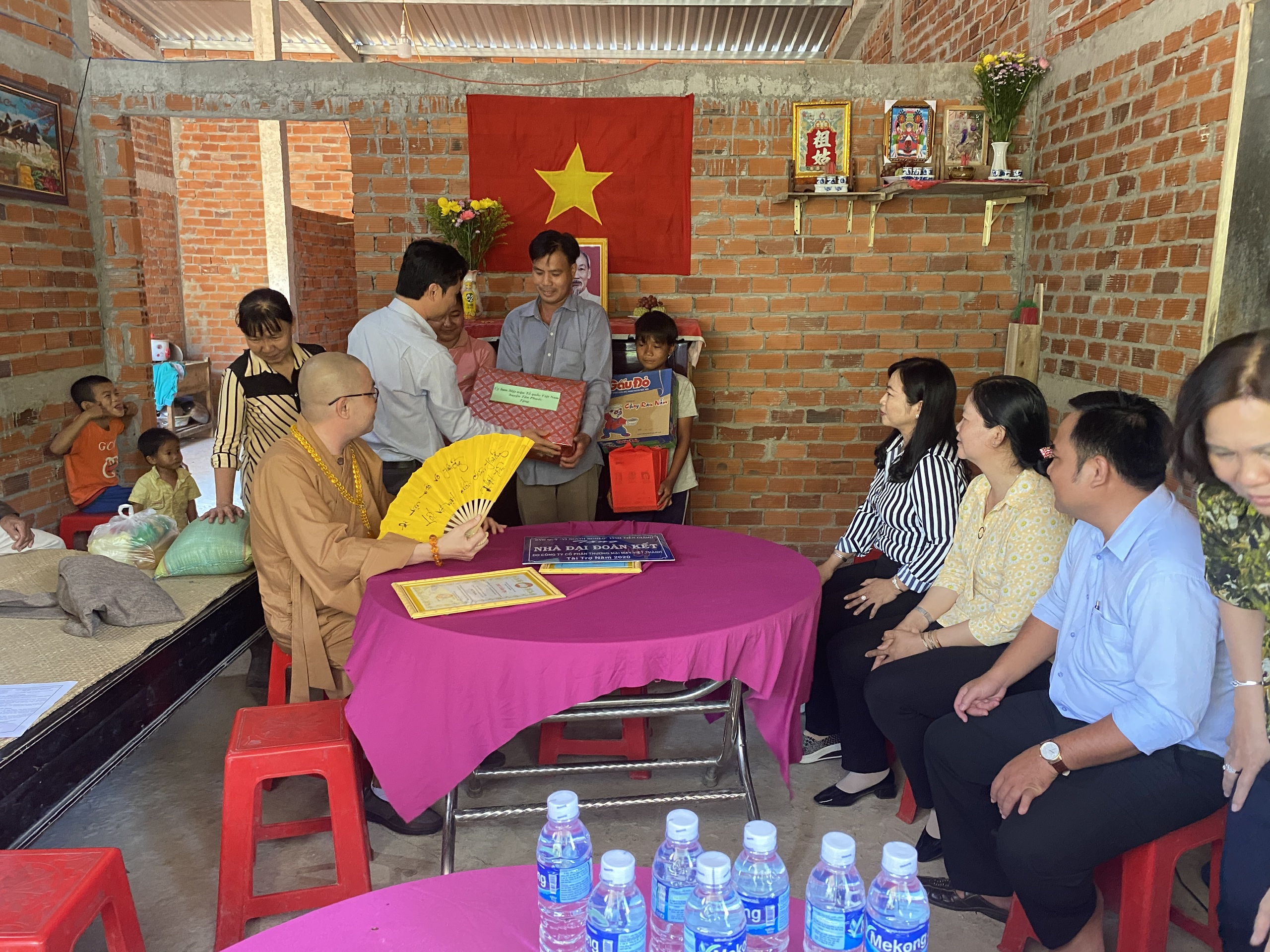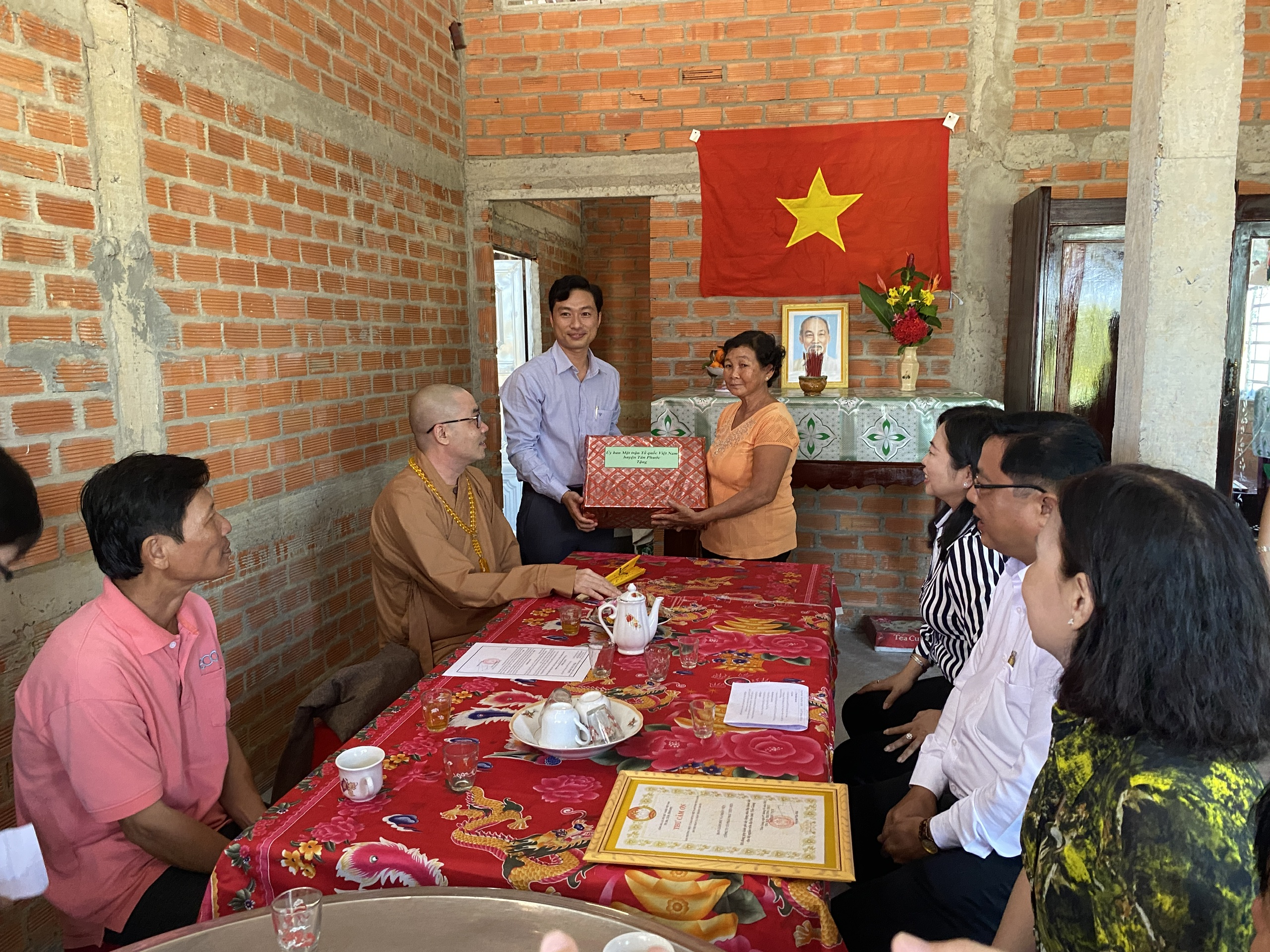 Buổi lễ bàn giao hai căn nhà có sự tham dự của TT.Thích Quảng Lộc – Phó BTS GHPGVN tỉnh Tiền Giang, Trưởng ban Từ thiện Xã hội Phật giáo tỉnh; bà Lê Thị Trang – UV Thường trực, Trưởng ban Phong trào Tôn giáo Dân tộc UB MTTQVN tỉnh; ông Phùng Văn Luân – Huyện ủy viên, Phó Chủ tịch UB MTTQVN huyện Tân Phước; ông Nguyễn Văn Thanh – Phó Bí thư xã Thạnh Mỹ; bà Lê Thị Bé Tiền – Phó Chủ tịch UBND xã Thạnh Mỹ; bà Phan Thị Diễm – Huyện ủy viên, Bí thư Đảng ủy xã Phước Lập; ông Nguyễn Hòa Anh – Phó Chủ tịch UBND xã Phước Lập; ông Hồ Thanh Khoa – Chủ tịch MTTQVN xã Phước Lập; bà Huỳnh Thị Thủy – Phó Giám đốc Cty May Tiền Tiến; bà Nguyễn Thị Sen – Phó GĐ Cty May Việt Thành; đại diện lãnh đạo các ấp sở tại và bà con địa phương với hai gia đình đồng tham dự.