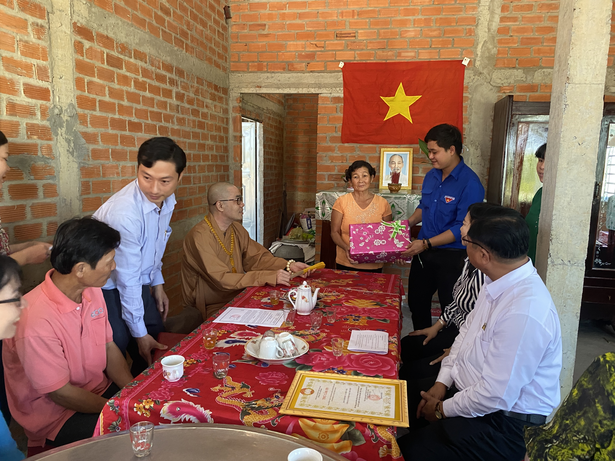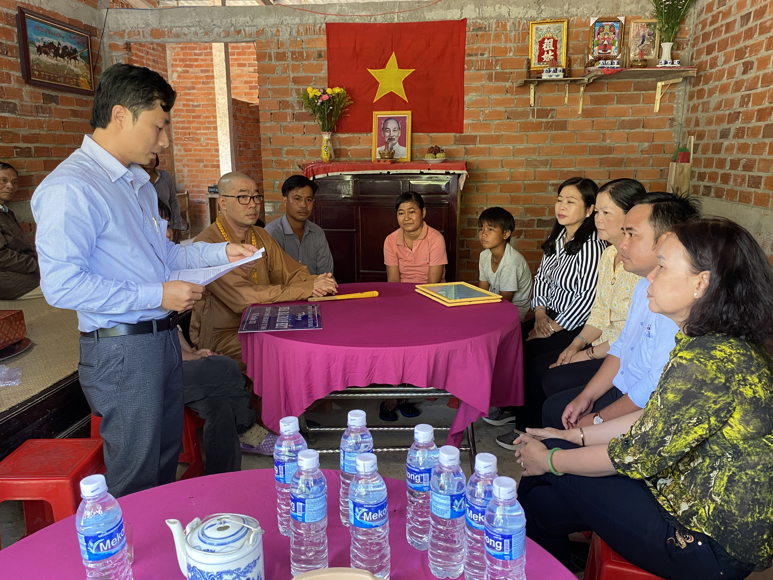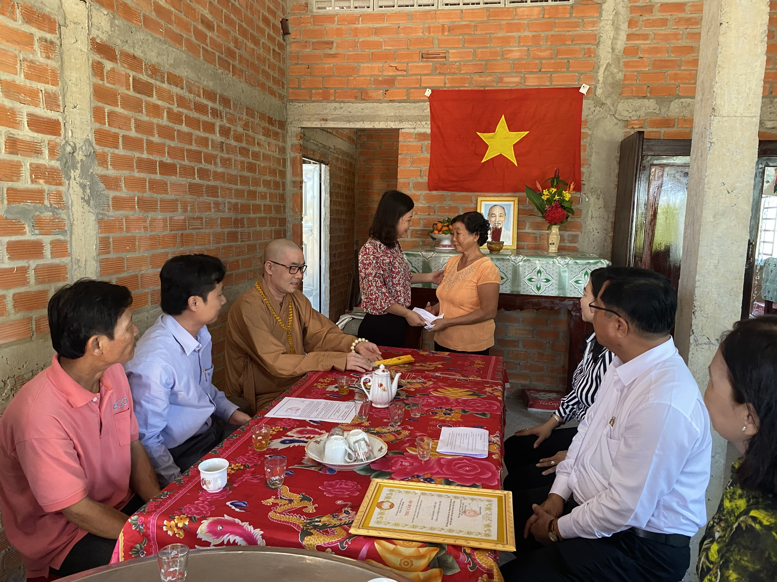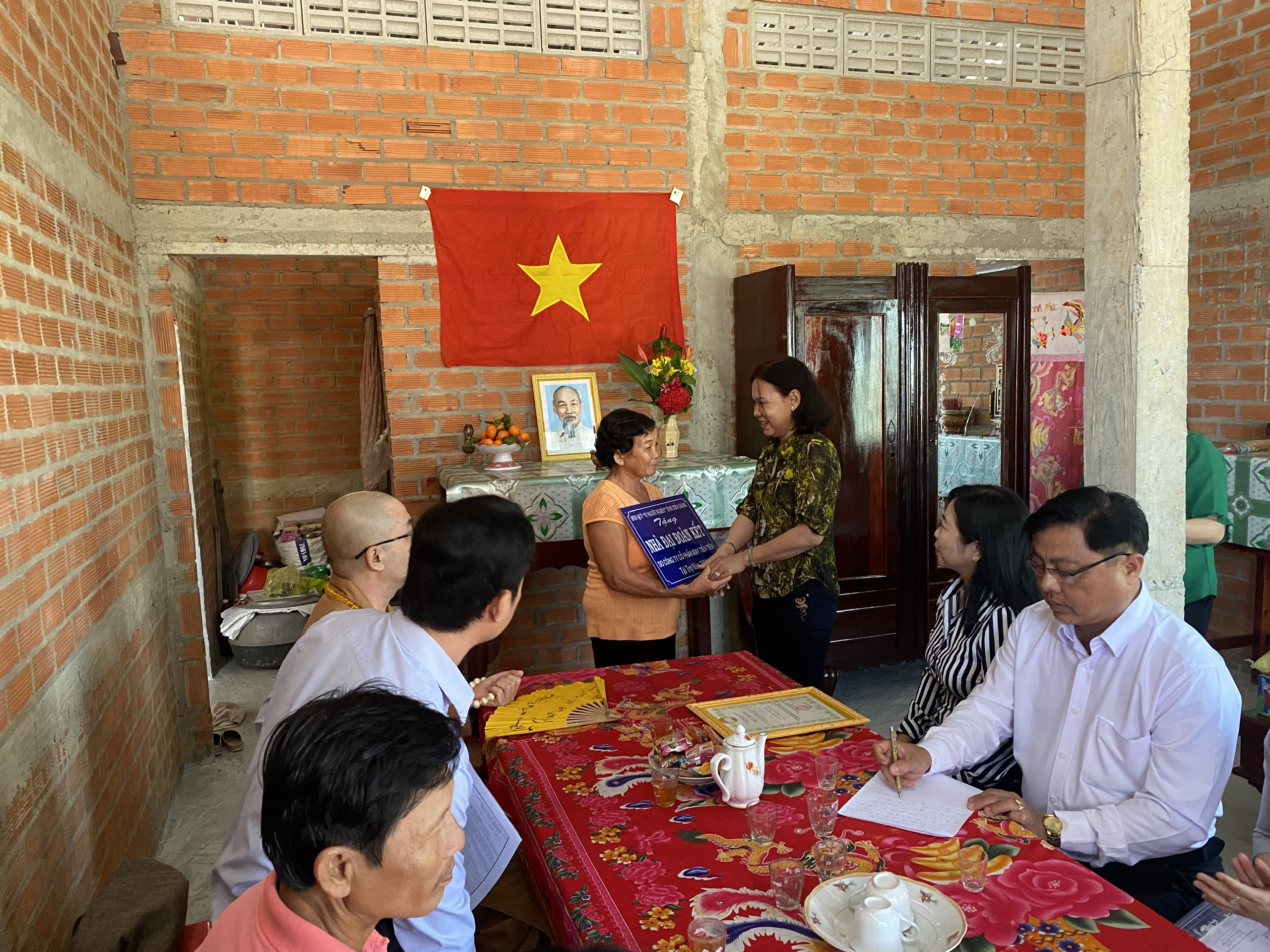 Buổi lễ bàn giao hai căn nhà có sự tham dự của TT.Thích Quảng Lộc – Phó BTS GHPGVN tỉnh Tiền Giang, Trưởng ban Từ thiện Xã hội Phật giáo tỉnh; bà Lê Thị Trang – UV Thường trực, Trưởng ban Phong trào Tôn giáo Dân tộc UB MTTQVN tỉnh; ông Phùng Văn Luân – Huyện ủy viên, Phó Chủ tịch UB MTTQVN huyện Tân Phước; ông Nguyễn Văn Thanh – Phó Bí thư xã Thạnh Mỹ; bà Lê Thị Bé Tiền – Phó Chủ tịch UBND xã Thạnh Mỹ; bà Phan Thị Diễm – Huyện ủy viên, Bí thư Đảng ủy xã Phước Lập; ông Nguyễn Hòa Anh – Phó Chủ tịch UBND xã Phước Lập; ông Hồ Thanh Khoa – Chủ tịch MTTQVN xã Phước Lập; bà Huỳnh Thị Thủy – Phó Giám đốc Cty May Tiền Tiến; bà Nguyễn Thị Sen – Phó GĐ Cty May Việt Thành; đại diện lãnh đạo các ấp sở tại và bà con địa phương với hai gia đình đồng tham dự.