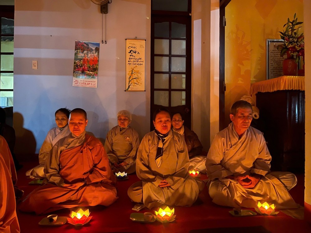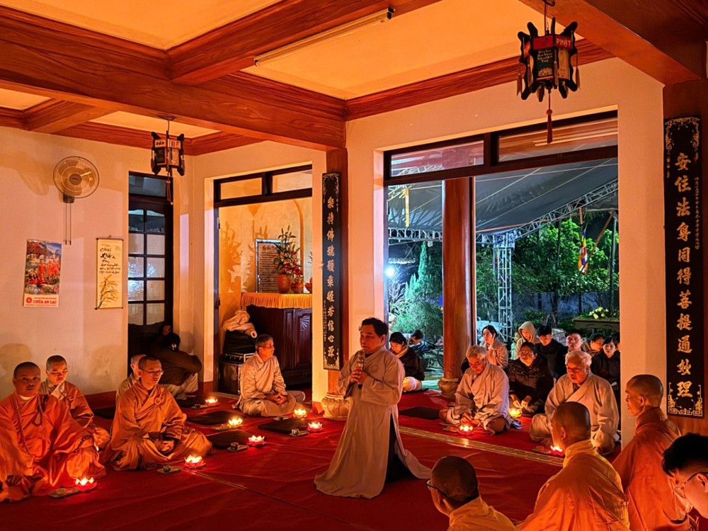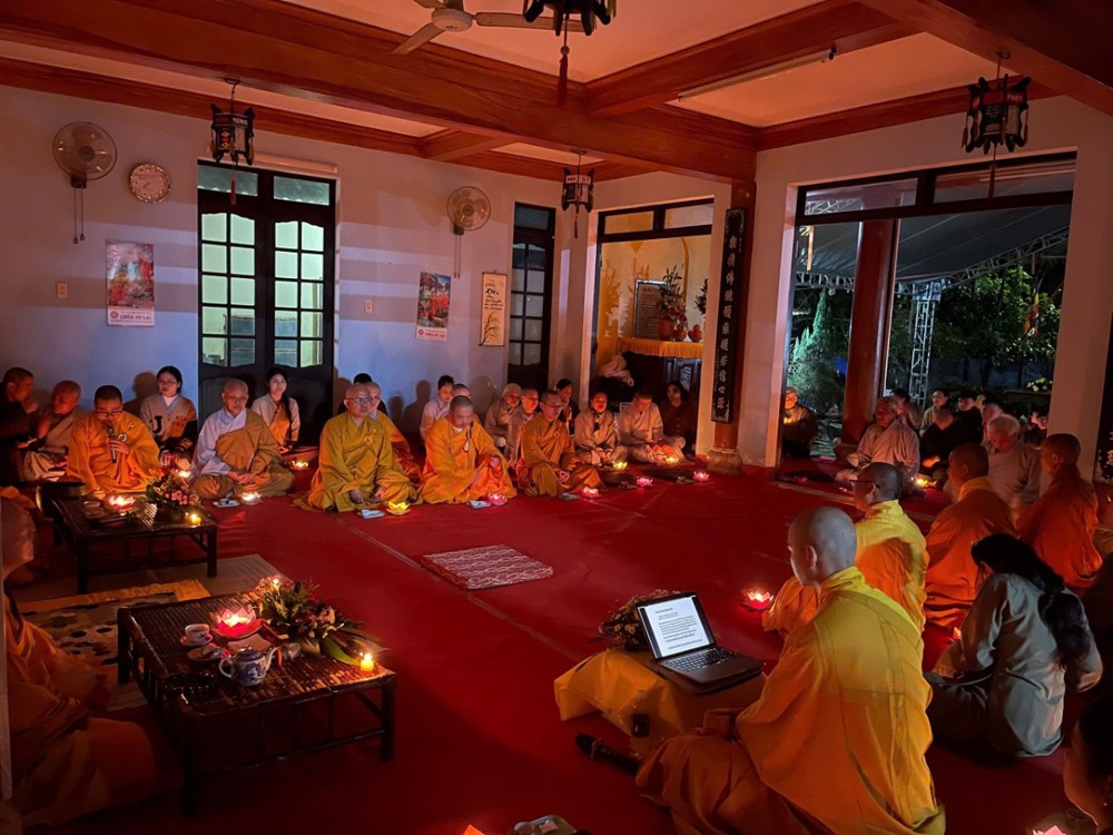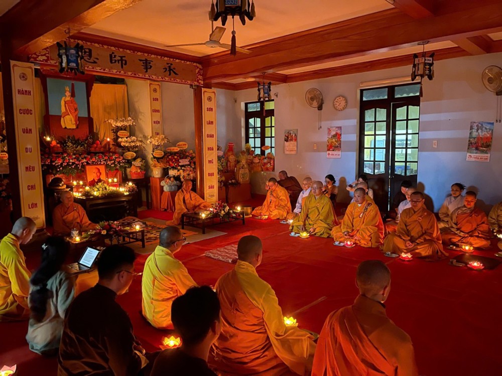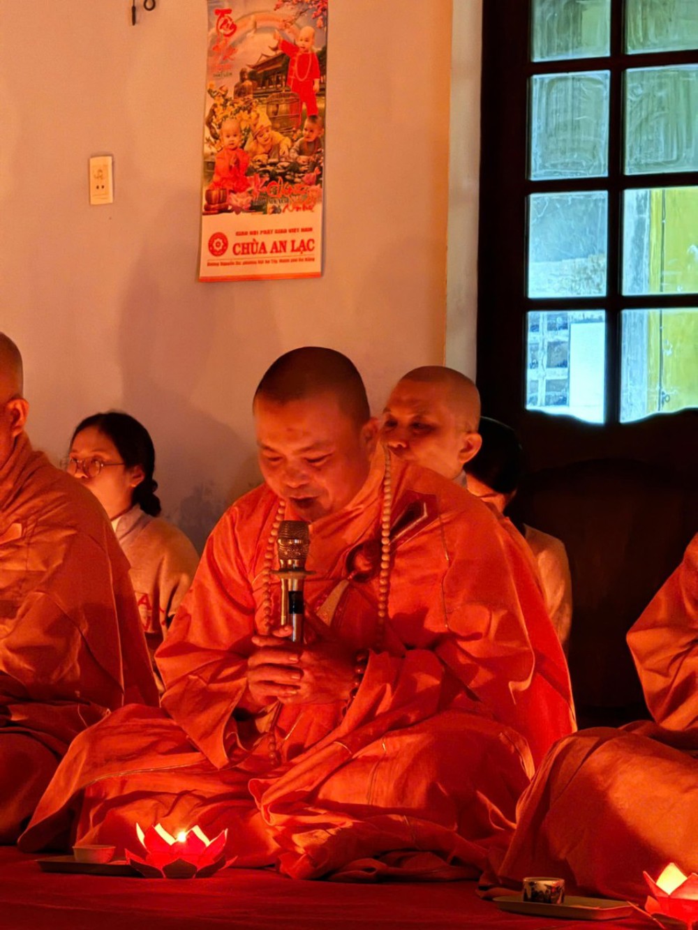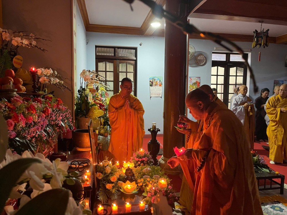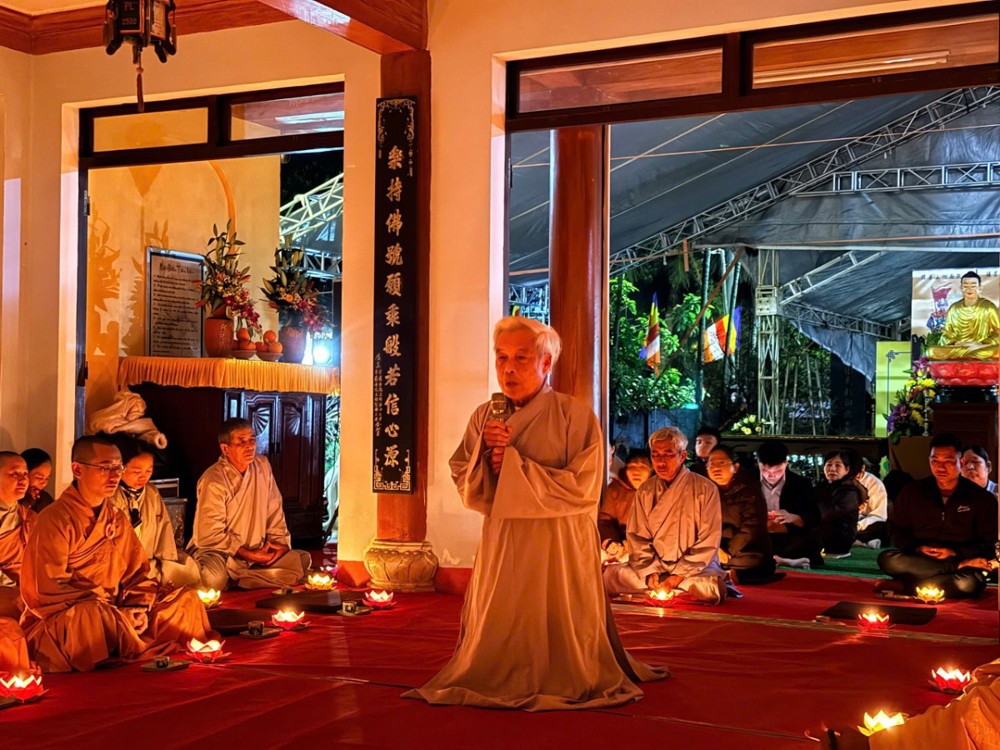 Môn đồ đệ tử cung đón Hòa thượng Thích Từ Nghiêm - Ủy viên HĐTS, Trưởng ban trị sự GHPGVN Tp. Đà Nẵng cùng chư tôn thiền Đức Tăng – Ni trụ trì và đạo tràng phật tử chùa An Lac, Pháp Hội, Tp. Đà Nẵng đồng về tham dự đêm đốt nến tưởng niệm.