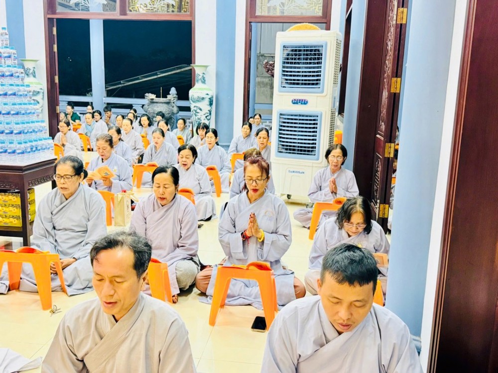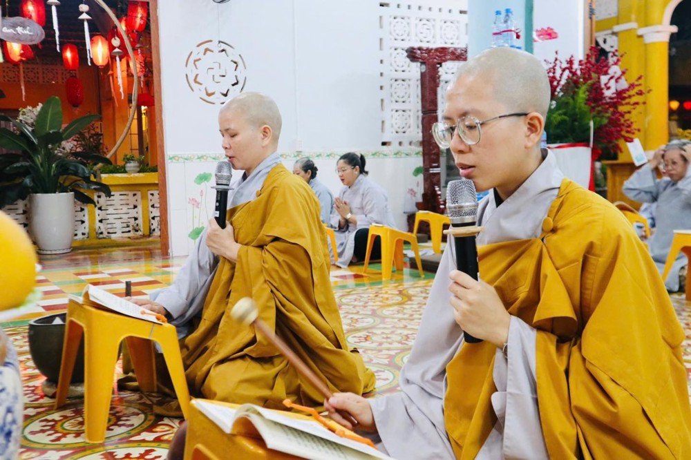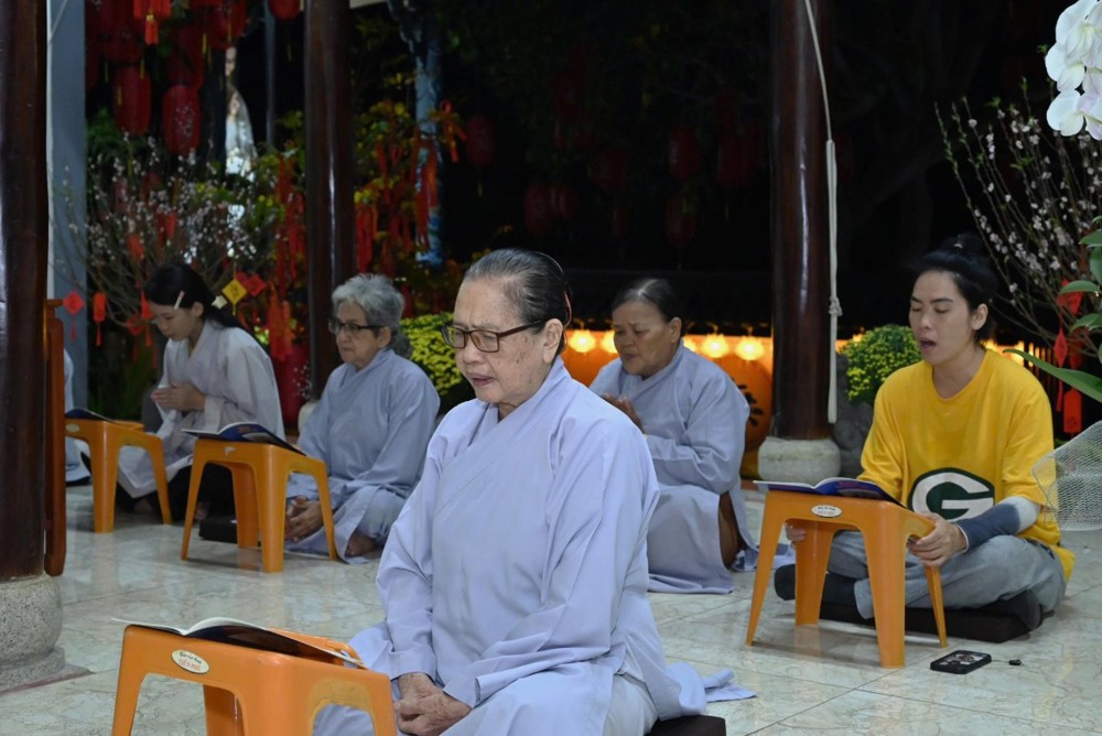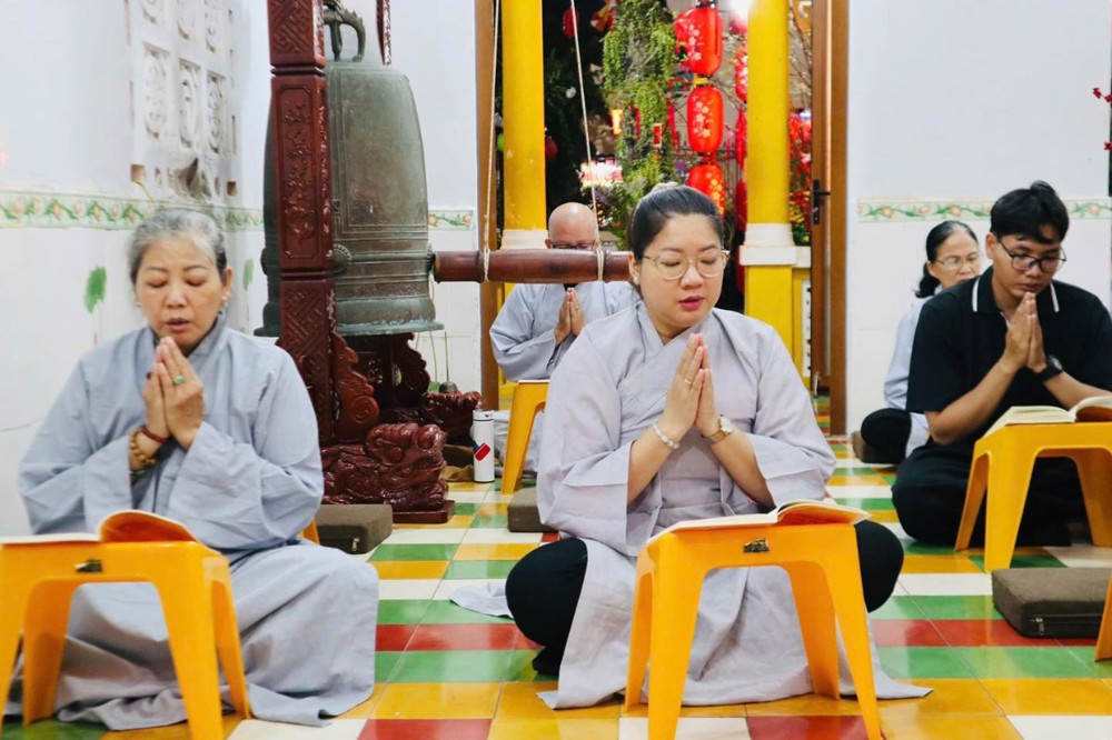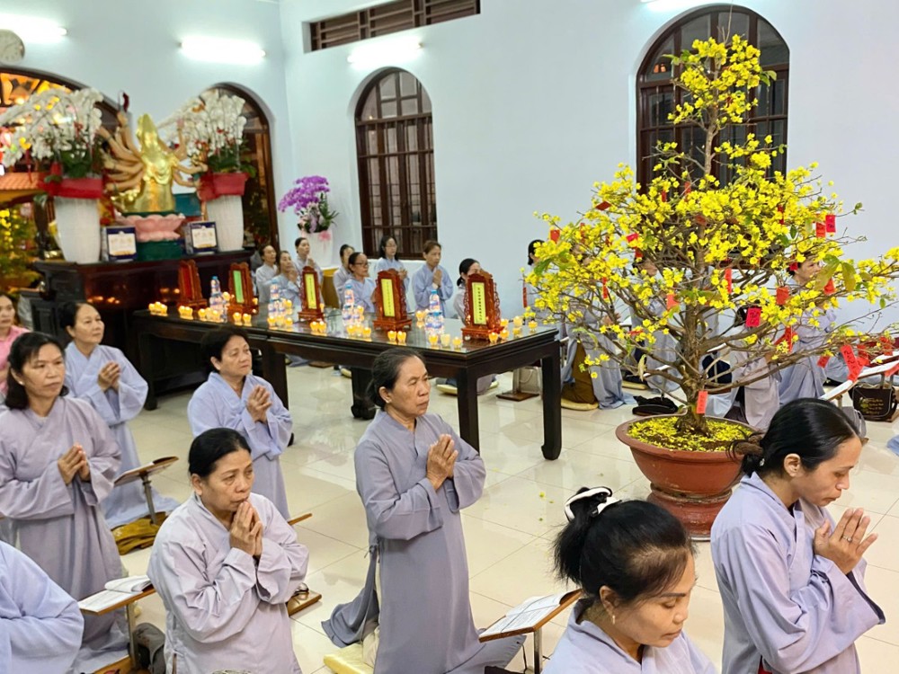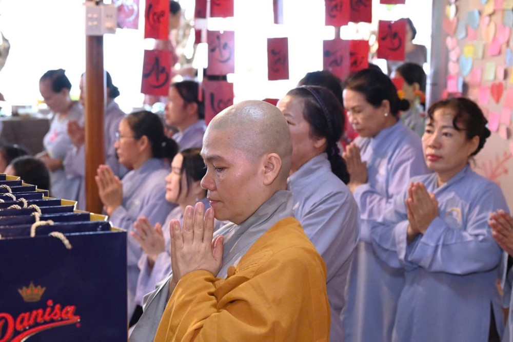 Ở chùa Phật Bửu, Sư cô Thích Nữ Diệu Ngọc hướng dẫn đạo tràng Phật tử nhất tâm cầu nguyện an lành.