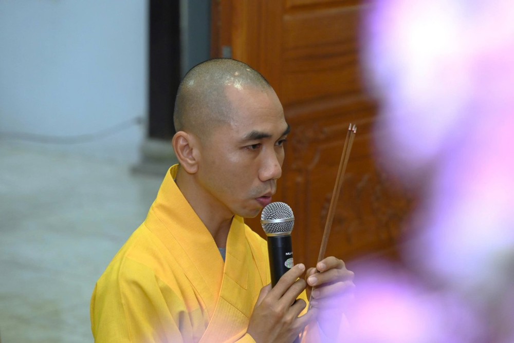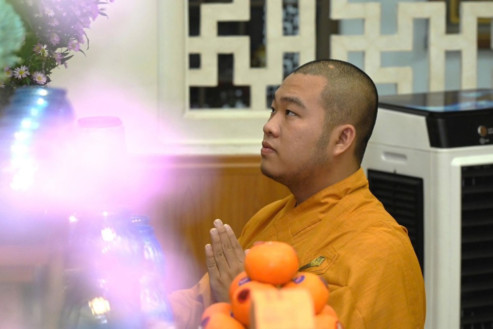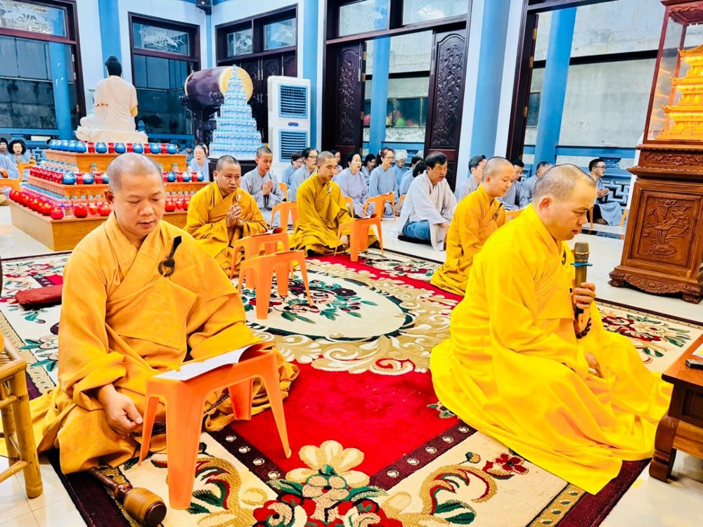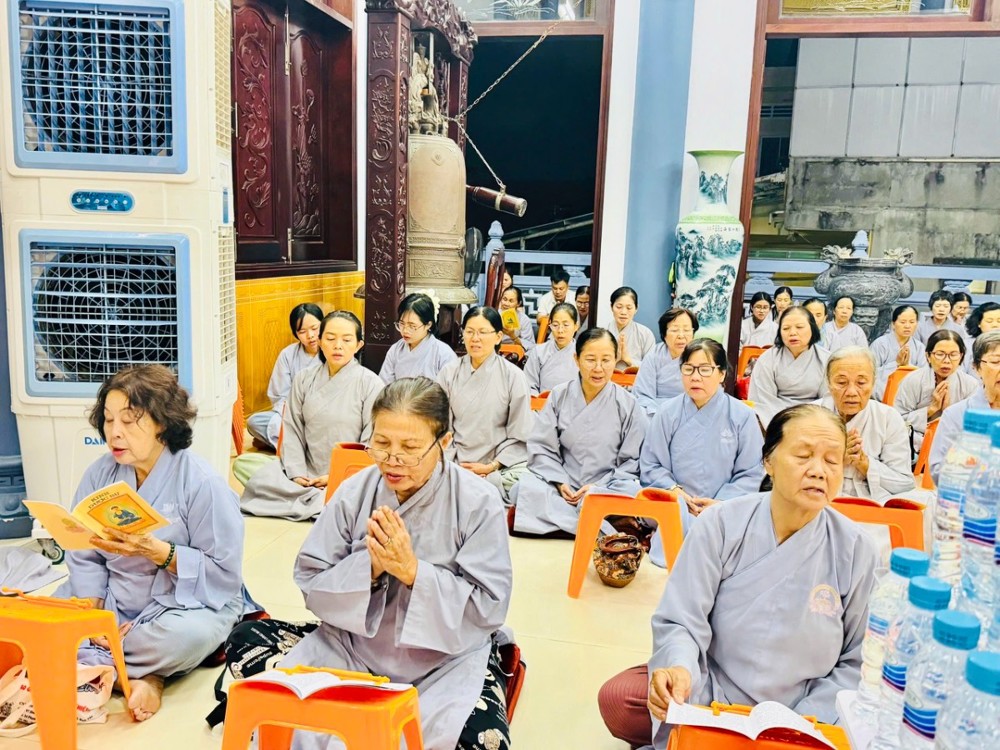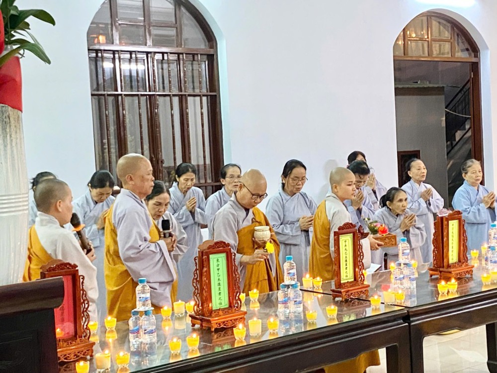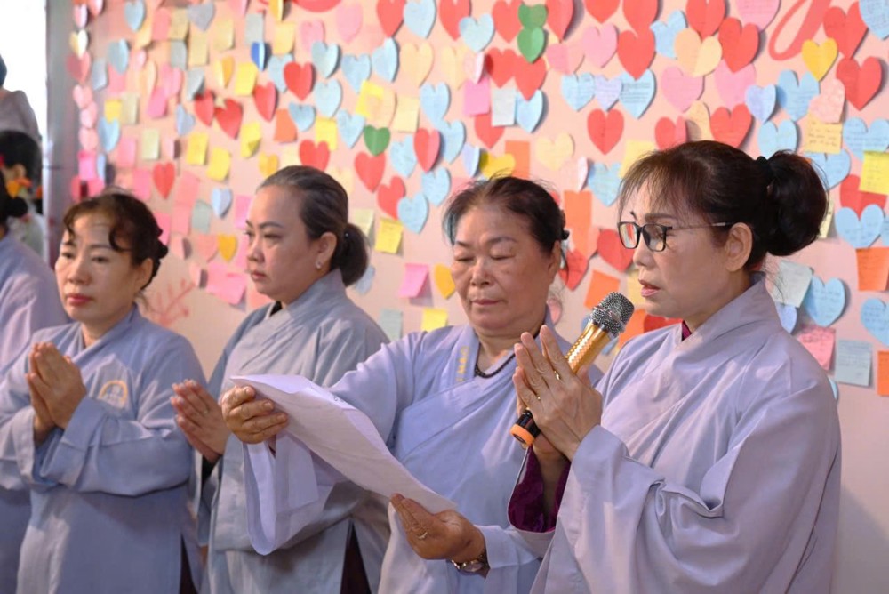 Ở chùa Phật Bửu, Sư cô Thích Nữ Diệu Ngọc hướng dẫn đạo tràng Phật tử nhất tâm cầu nguyện an lành.