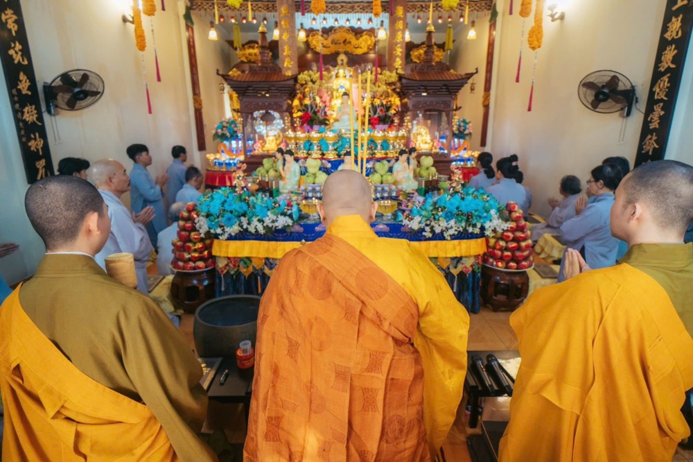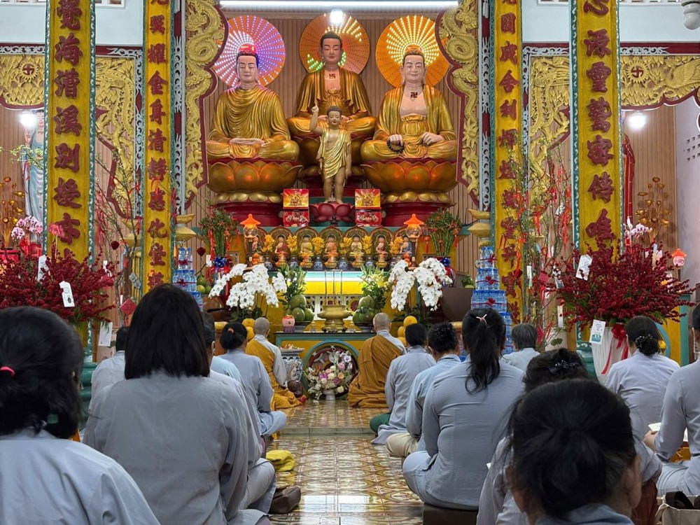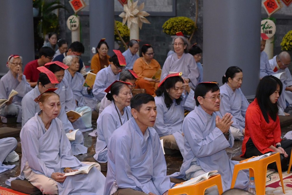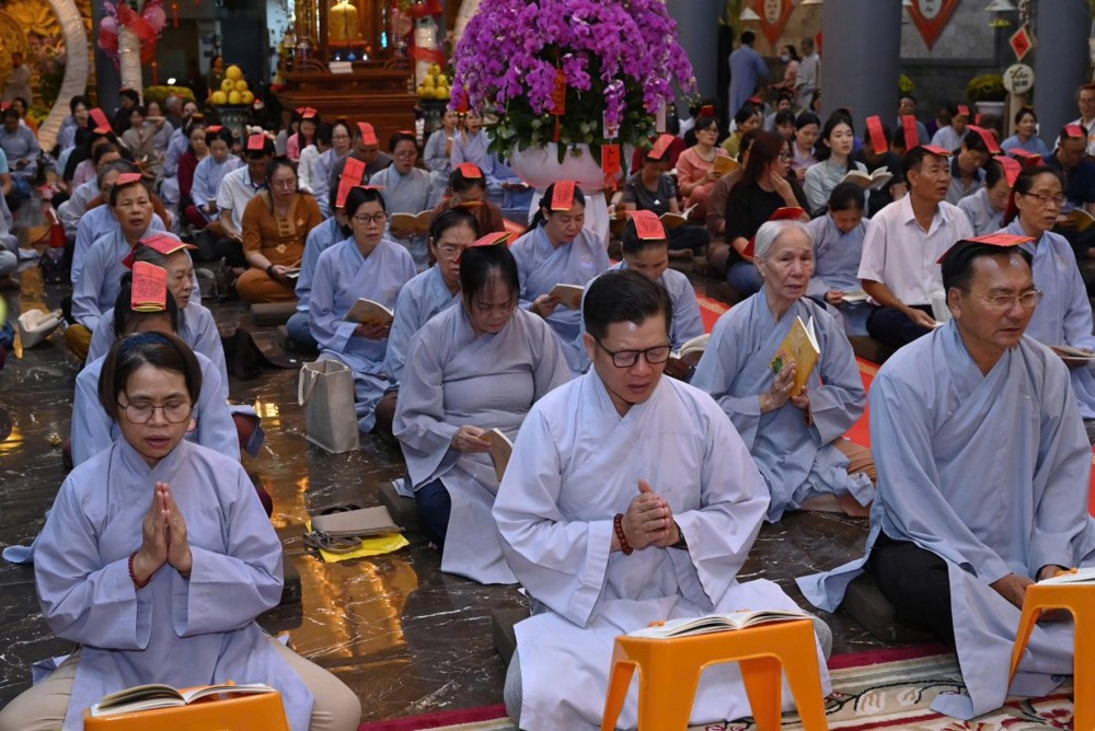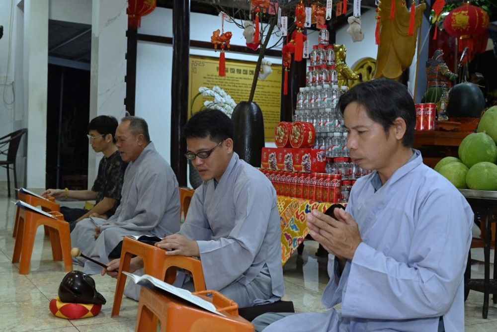 Không khí tu học cũng lan tỏa tại chùa Hoa Sơn, nơi Đại đức Thích Trung Tú hướng dẫn đạo tràng Phật tử tụng kinh cầu nguyện bình an.