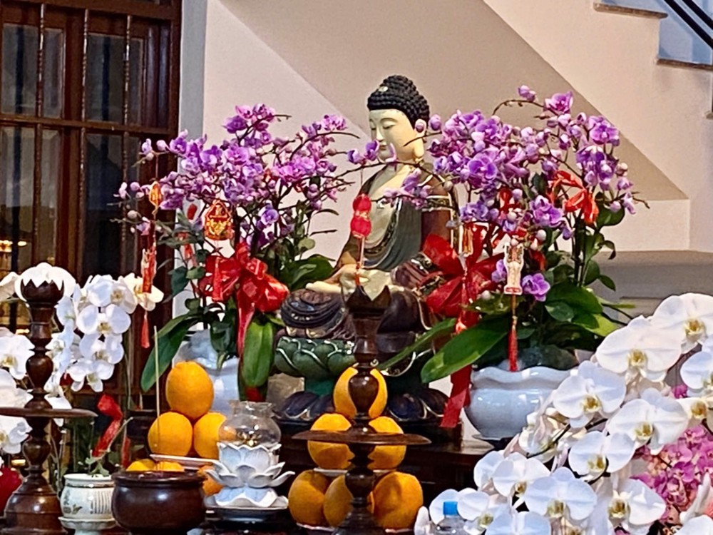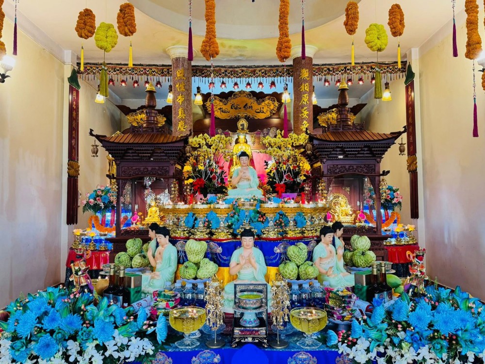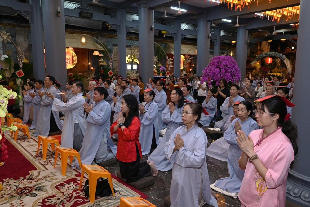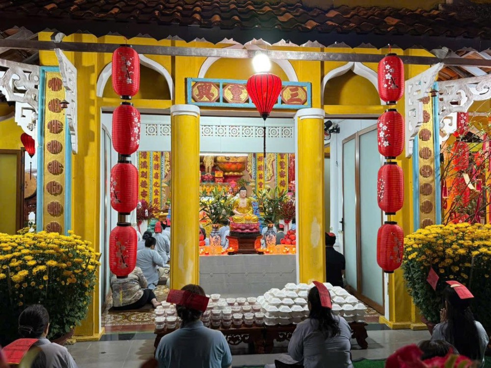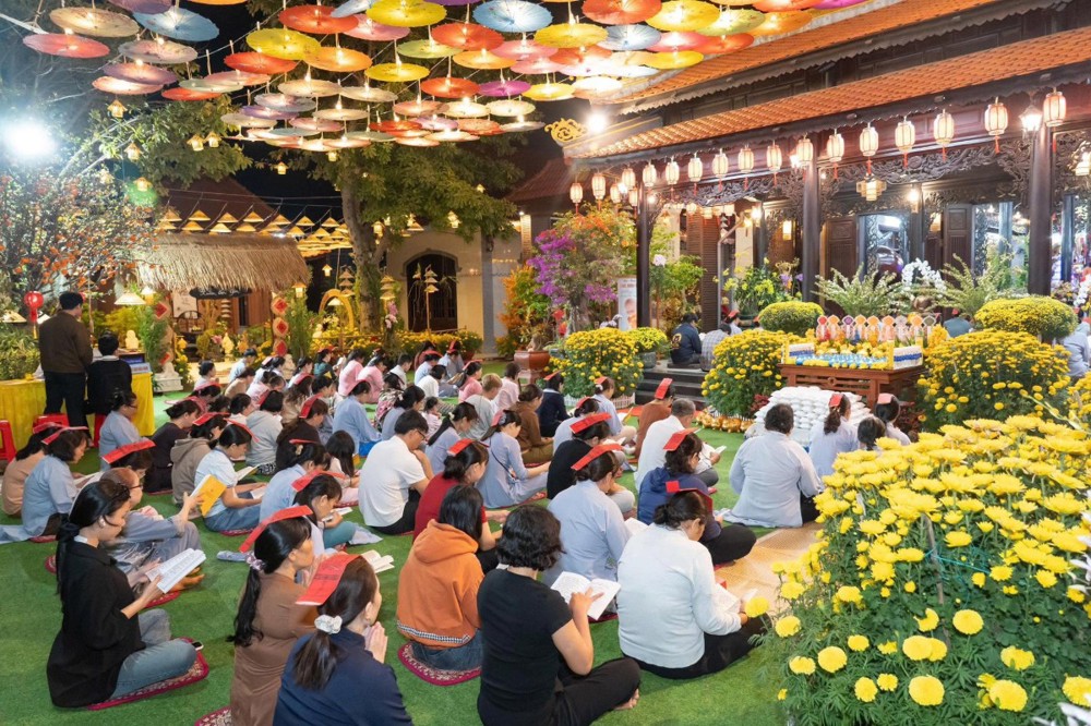 Không khí tu học cũng lan tỏa tại chùa Hoa Sơn, nơi Đại đức Thích Trung Tú hướng dẫn đạo tràng Phật tử tụng kinh cầu nguyện bình an.