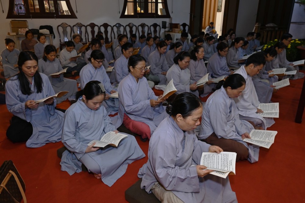 Tại Linh Quang tịnh xá, Ni sư Thích Nữ Phước Minh hướng dẫn Phật tử trì tụng kinh Dược Sư đầu năm.