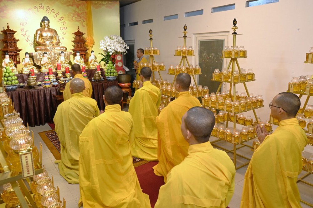 Ở Tu viện Vạn Liên, Đại đức Thích Nguyện Truyền hướng dẫn đại chúng tụng kinh Dược Sư, nhất tâm kỳ nguyện quốc thái dân an.
