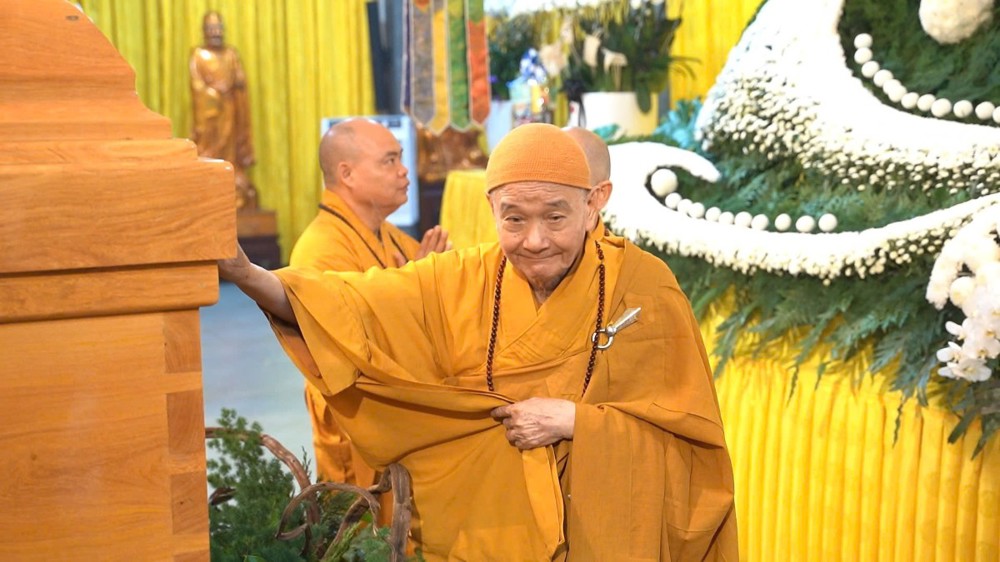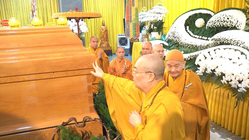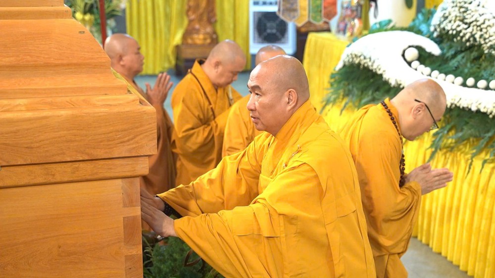 Trong giây phút trang nghiêm, chư Tôn đức lần lượt hữu nhiễu kim quan, tiễn biệt bậc pháp lữ khả kính - người đã cùng chư vị Trưởng lão, góp phần xây dựng và phát triển Giáo hội.