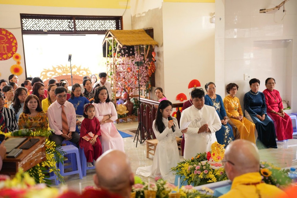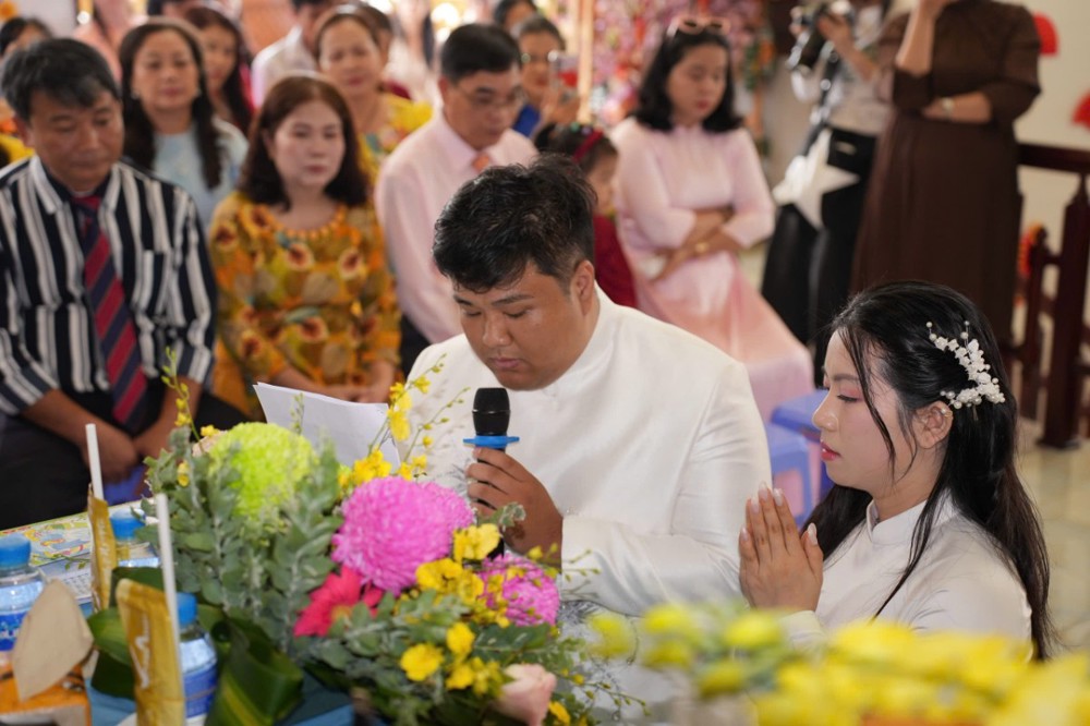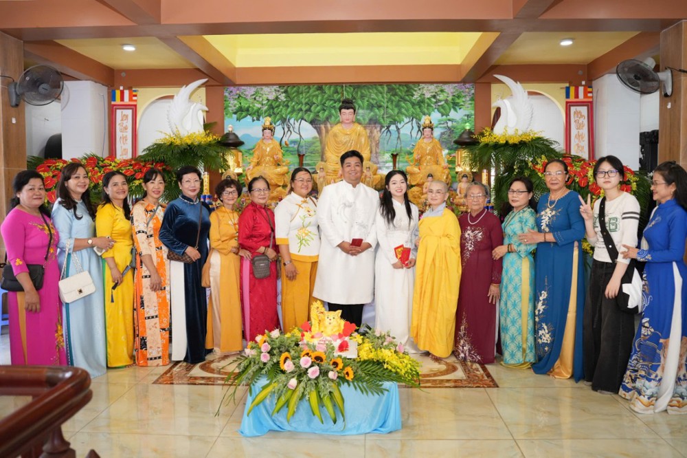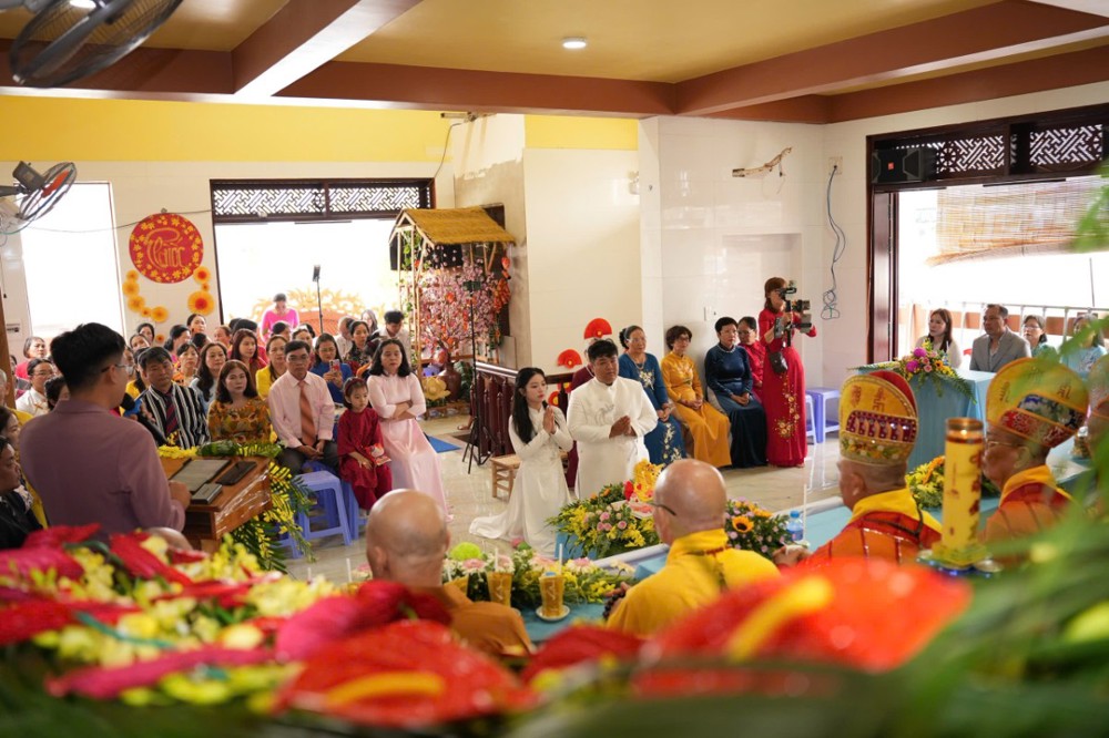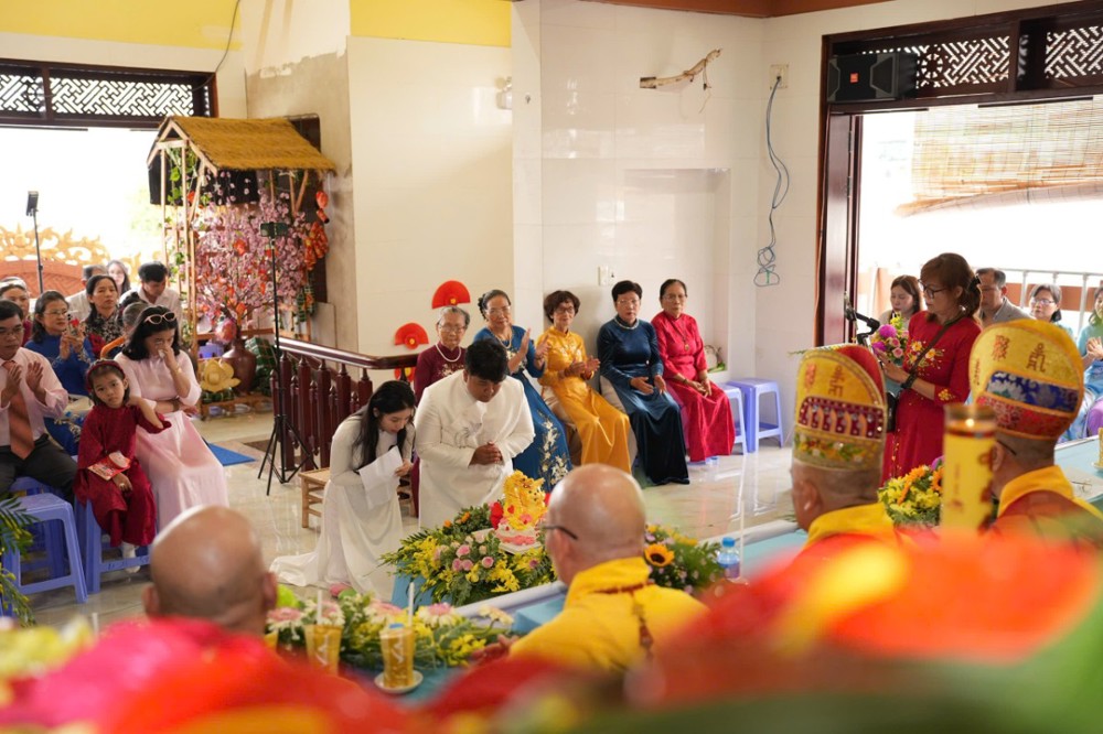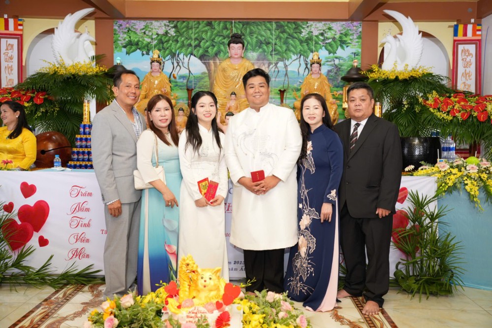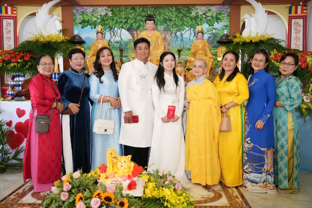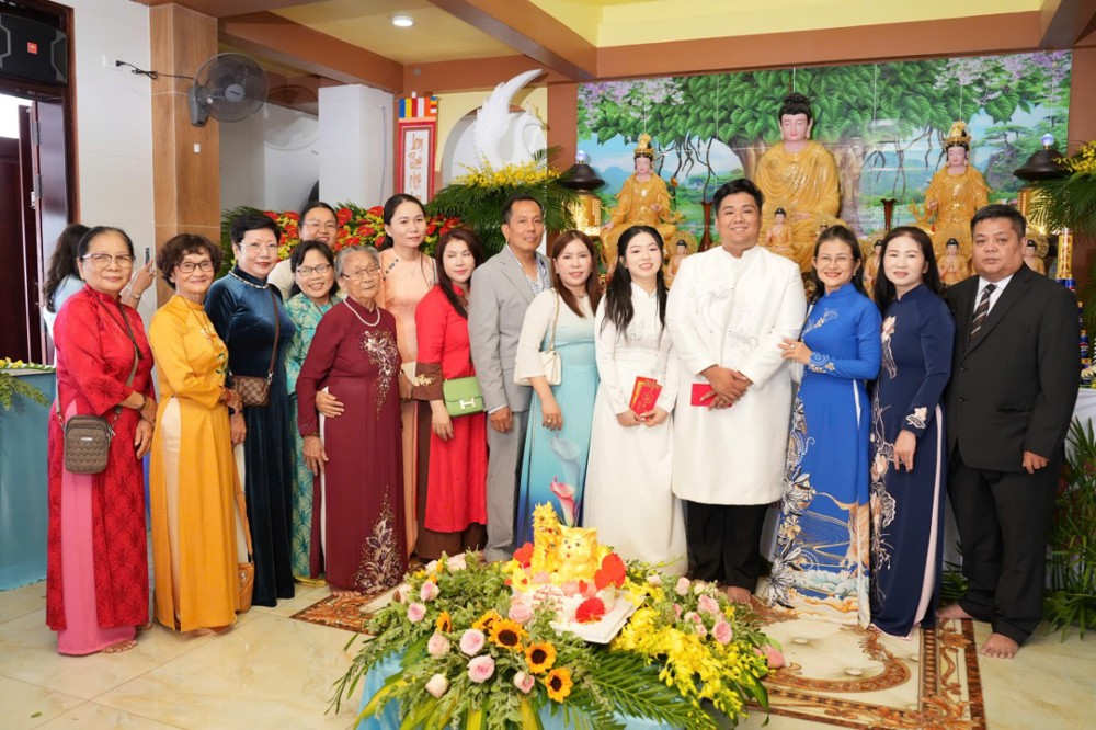 Buổi lễ khép lại trong tiếng niệm Phật trầm hùng, giữa không gian thanh thoát của khói hương và ánh nến lung linh. Cả đạo tràng như lắng lại trong niềm hoan hỷ. Cha mẹ hai bên xúc động khi chứng kiến con cái nên duyên dưới mái chùa – nơi đạo và đời gặp nhau trong ánh sáng của từ bi, trí tuệ.