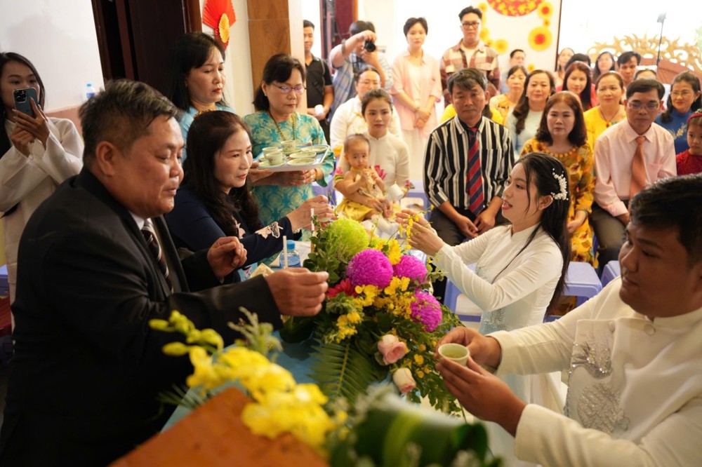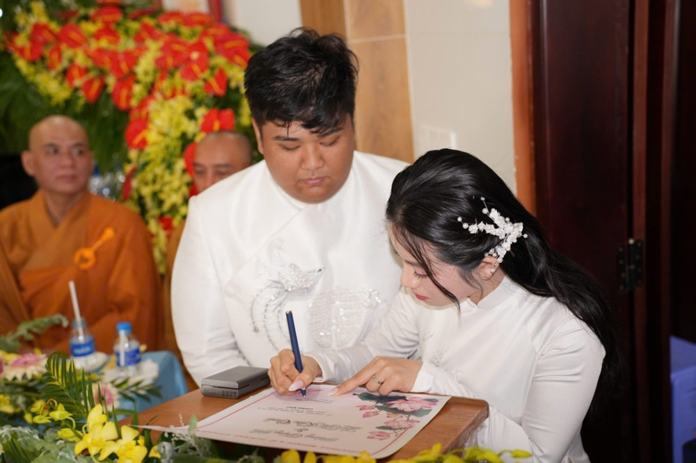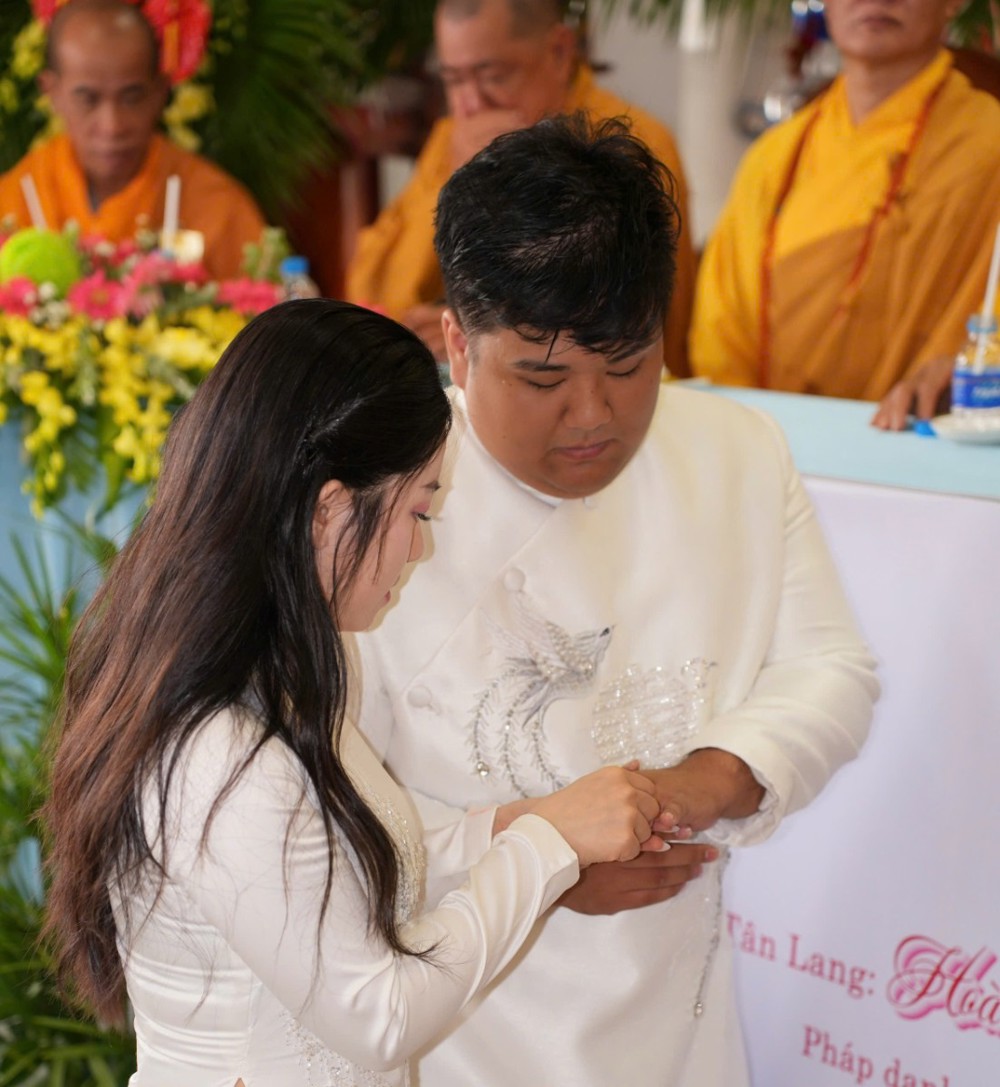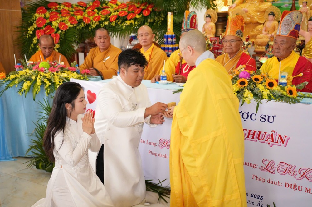 Dưới ánh sáng Tam bảo, đôi tân lang tân nương thành kính đảnh lễ chư Phật, dâng hương cúng dường và đón nhận lời chúc phúc từ chư Tôn đức Tăng Ni. Khoảnh khắc thiêng liêng nhất là khi cô dâu chú rể Hoàng Trọng Ân (pháp danh Minh Trọng) trao nhẫn cưới cho cô dâu Lê Thị Kiều Oanh (pháp danh Diệu Mai) trước sự chứng kiến của chư Tôn đức Tăng Ni và cha mẹ họ hàng nội ngoại 2 bên. Tiếng chuông mõ ngân vang trầm hùng, tiếng niệm Phật thanh thoát như lời chứng minh của mười phương chư Phật cho nhân duyên thù thắng của đôi bạn trẻ.