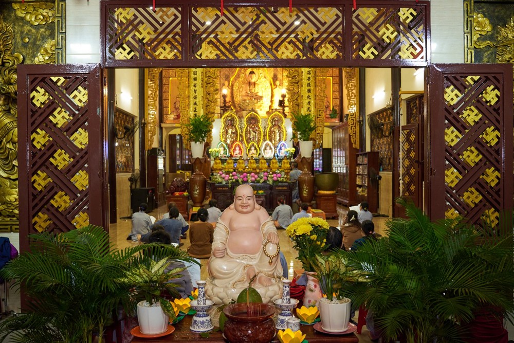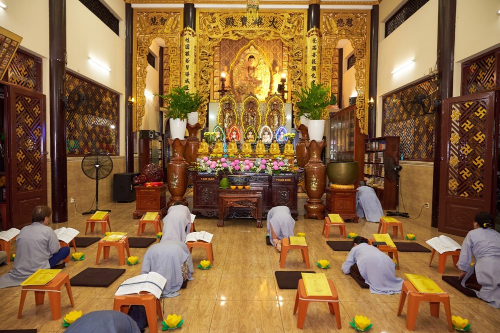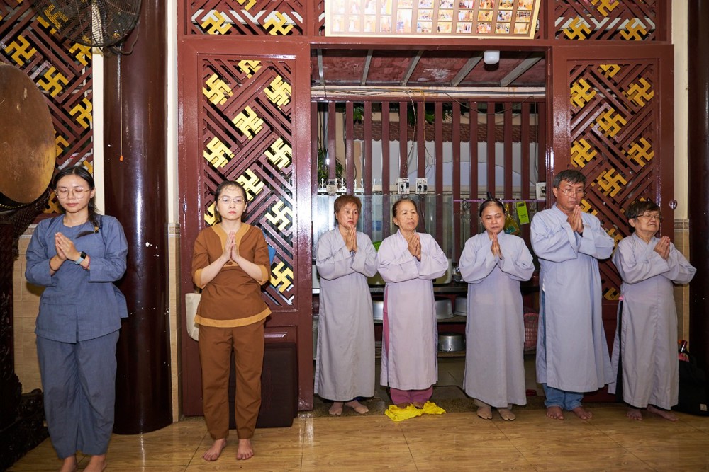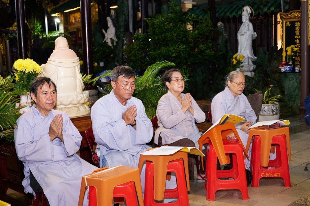 Sau nghi thức thắp nến, các Phật tử cùng nhau niệm Hồng danh Bồ Tát và kinh hành quanh khuôn chánh điện, từng bước nhẹ nhàng trong chánh niệm. Tiếng niệm “Nam mô Đại Bi Quán Thế Âm Bồ Tát” vang lên hòa cùng ánh nến, như dòng suối mát lành tưới tẩm tâm hồn người con Phật.