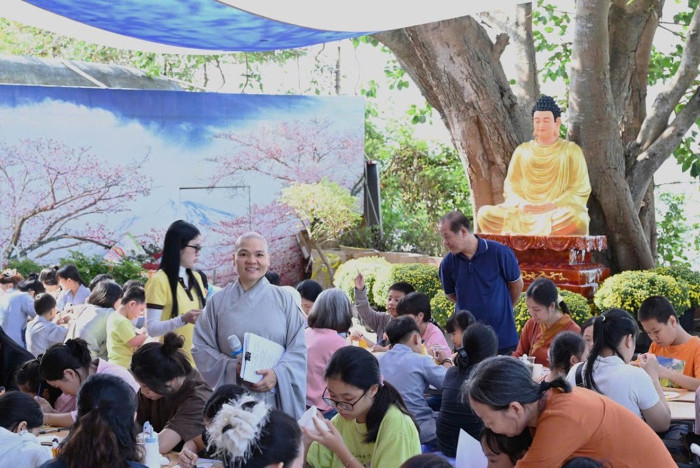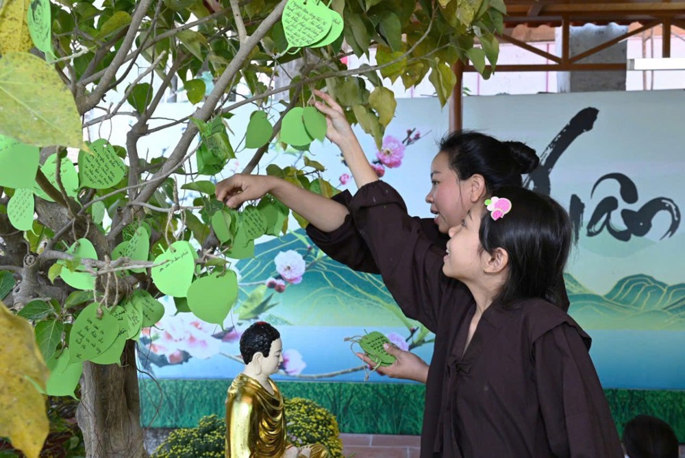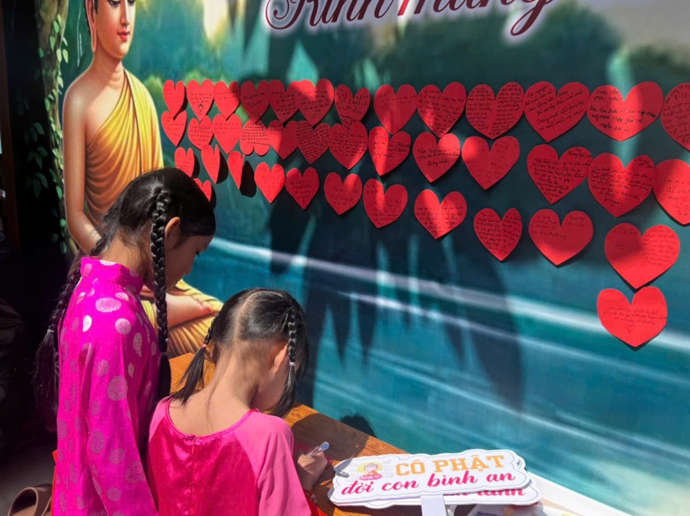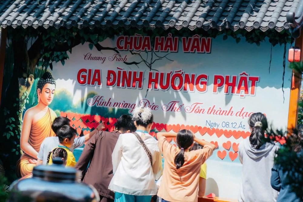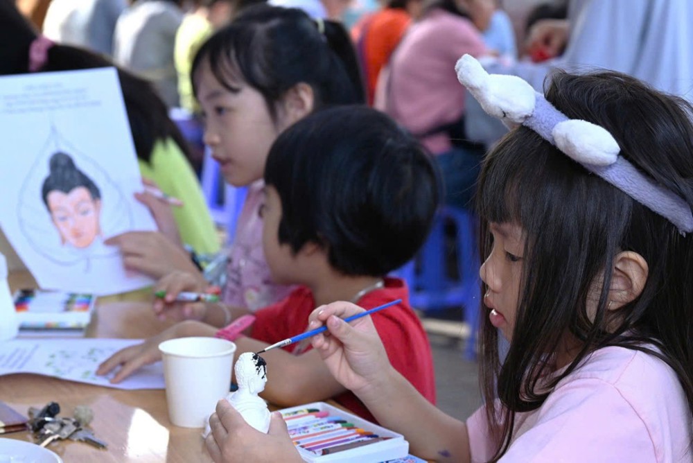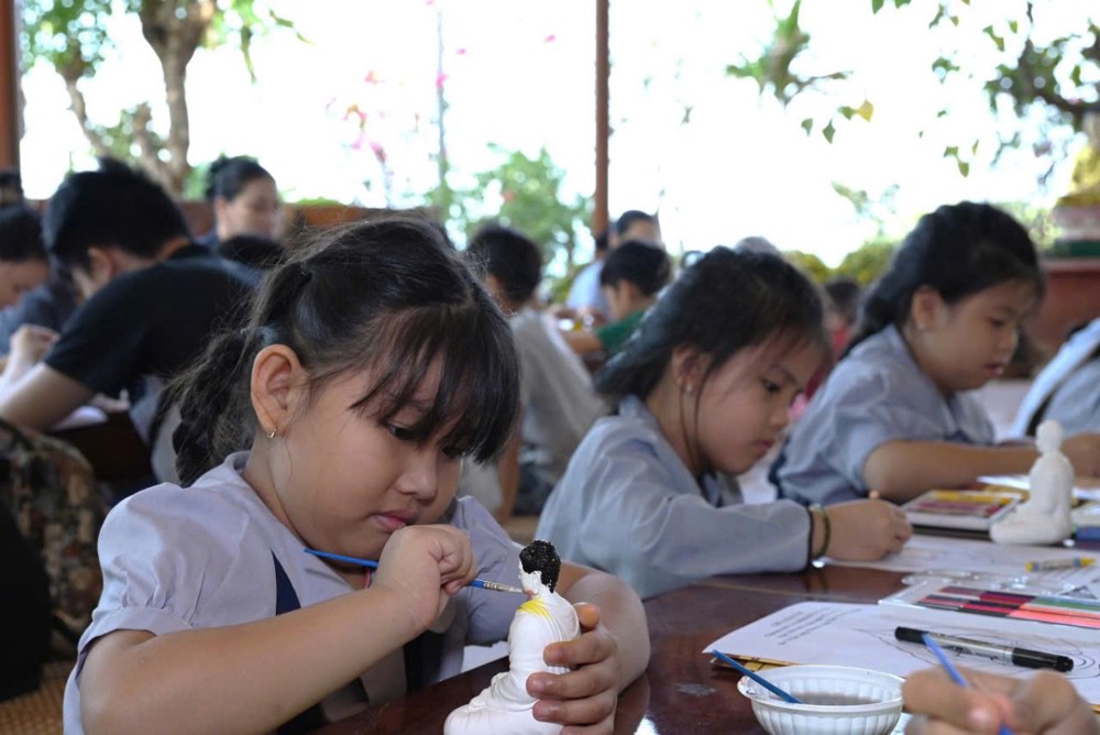 Tiếp đó, các Phật tử và gia đình tham gia nhiều hoạt động ý nghĩa như: tô vẽ hình tượng Đức Phật thành đạo, chép kinh, viết lời ước nguyện. Những hoạt động này không chỉ tạo không gian tu tập tỉnh thức mà còn giúp các gia đình gắn kết trong đời sống tâm linh, gieo trồng hạt giống thiện lành, nuôi dưỡng niềm tin đối với Phật pháp.