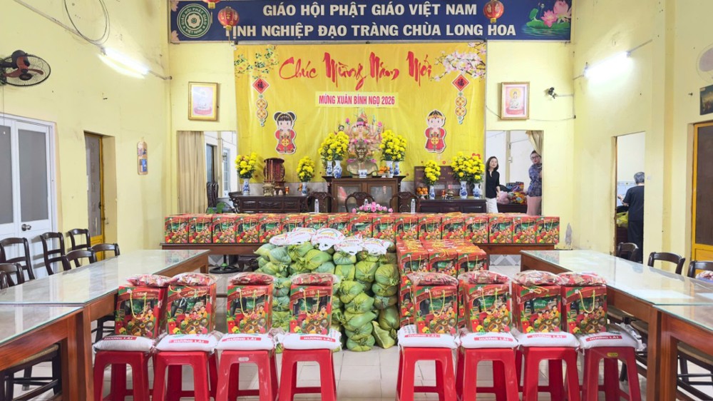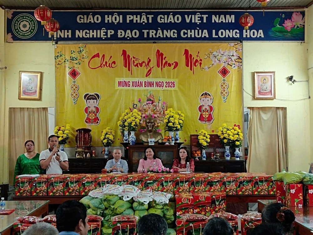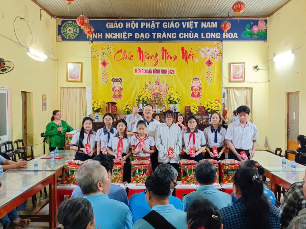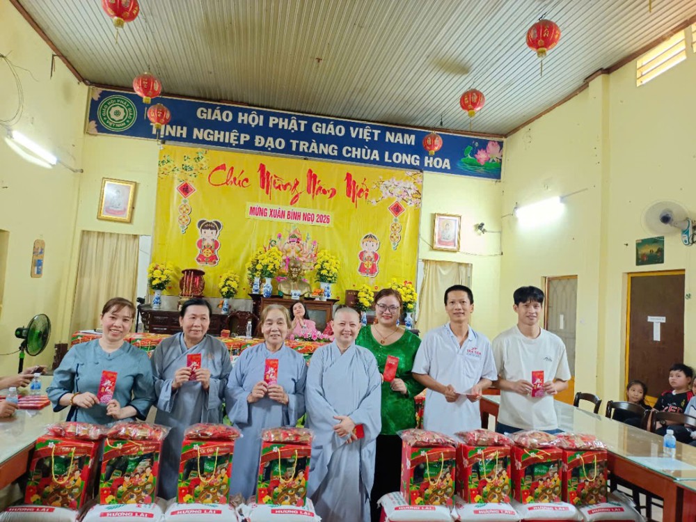 Trên tinh thần lan tỏa yêu thương ấy, ngày 08/02/2026, chùa Long Hoa đã tổ chức chương trình trao tặng 300 phần quà Xuân Bính Ngọ 2026. Mỗi phần quà trị giá 500.000 đồng, gồm nhu yếu phẩm và bao thư tiền mặt 200.000 đồng. Tuy giá trị vật chất không lớn nhưng đó là tất cả tấm lòng của chư Ni, quý Phật tử và các Mạnh thường quân gần xa dành cho bà con nhân dịp năm mới.