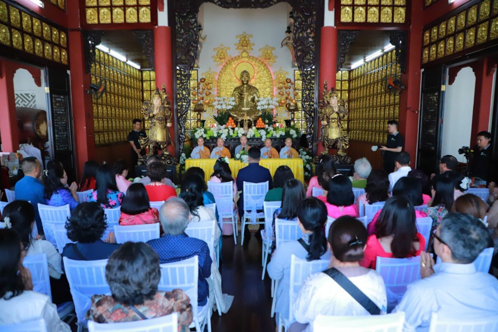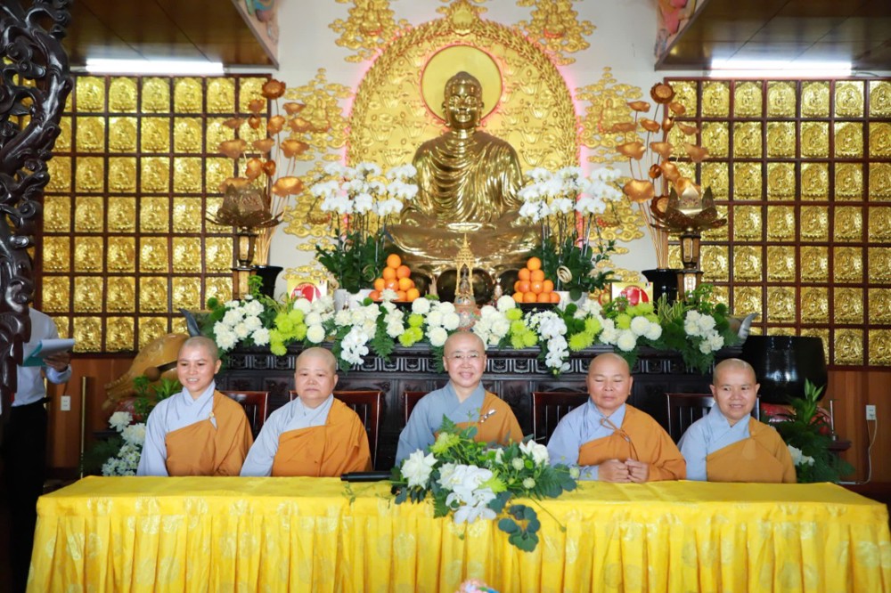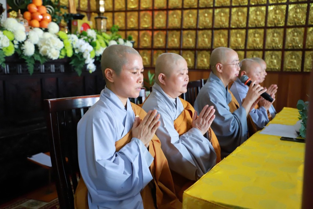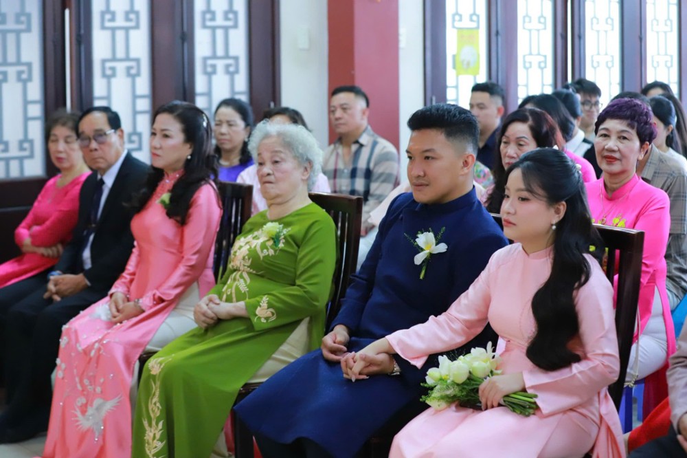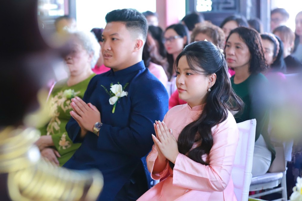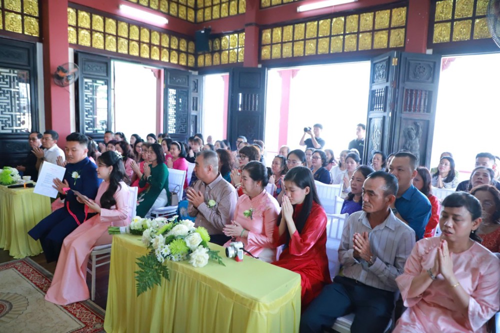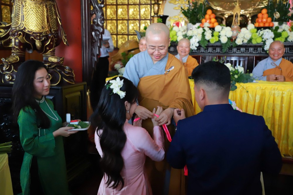 Tiếp đó, chư Tôn đức Ni và toàn thể đại chúng vân tập tại Đại hùng Bảo điện, cử hành các nghi thức tâm linh truyền thống như dâng hương, đảnh lễ Tam Bảo, trì tụng Chú Đại Bi và sái tịnh đạo tràng, cầu nguyện cho đôi tân hôn được gia hộ phước lành, đời sống hôn nhân an vui, bền vững.