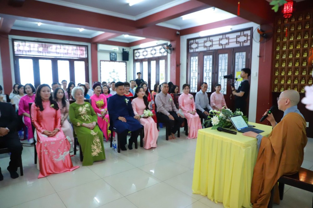 Trước khi cử hành nghi thức thành hôn, quan viên hai họ vân tập về giảng đường, trang nghiêm tham dự thời thính pháp với chủ đề “Đời sống hôn nhân theo lời Phật dạy, nuôi dưỡng tình thương và chánh niệm” do Ni sư Thích Nữ Huệ Dâng chủ giảng.