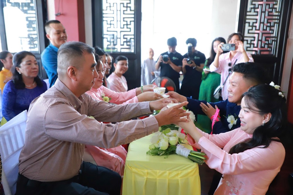 Nghi thức trao nhẫn cưới và kết dây tơ hồng được cử hành trong không khí trang trọng, đánh dấu thời khắc đôi bạn trẻ chính thức trở thành vợ chồng trong ánh sáng của Tam Bảo. Sau đó là các nghi thức dâng trà hiếu kính cha mẹ, cắt bánh cưới và ký Hiệp ước sống chung hòa bình, thể hiện quyết tâm xây dựng đời sống hôn nhân tỉnh thức, hòa hợp và trách nhiệm.