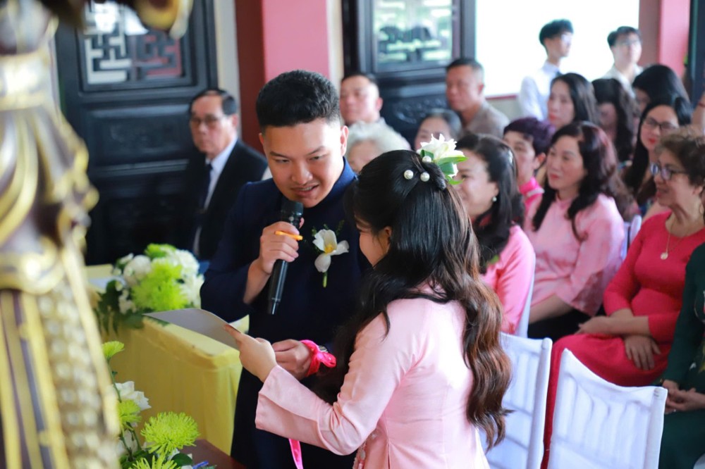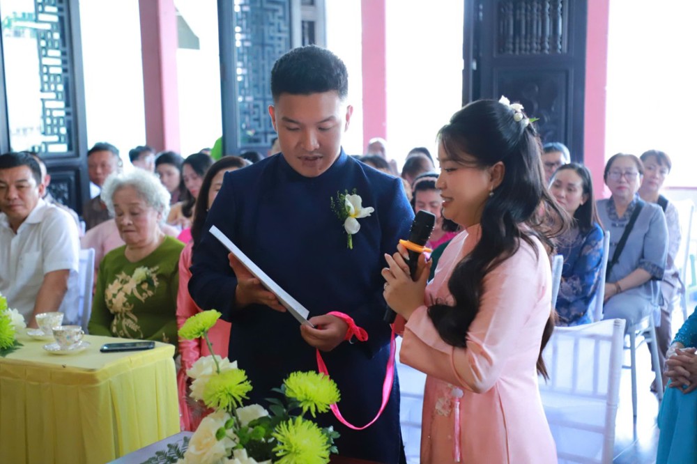 Trước sự chứng minh của chư Tôn đức, đôi tân hôn đã trang nghiêm phát nguyện đạo vợ chồng, nguyện sống đời lương thiện, tương kính, đồng hành vượt qua mọi thăng trầm và nuôi dạy con cháu nên người. Và kí kết hiệp ước sống chung hoà bình.