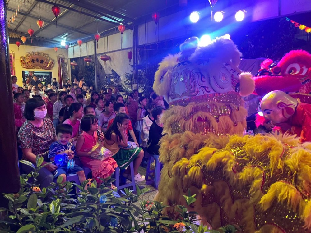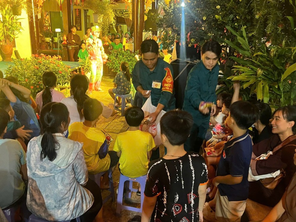 Không khí đêm hội rộn ràng với các trò chơi đặc biệt như múa lân, văn nghệ, ảo thuật, tặng quà và bánh Trung thu, mang đến niềm vui trọn vẹn cho các em.