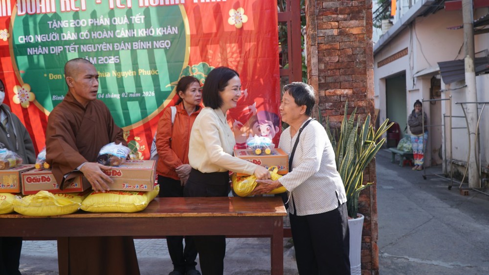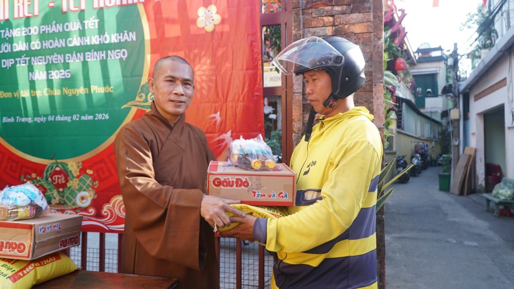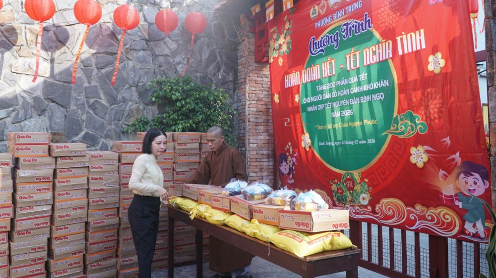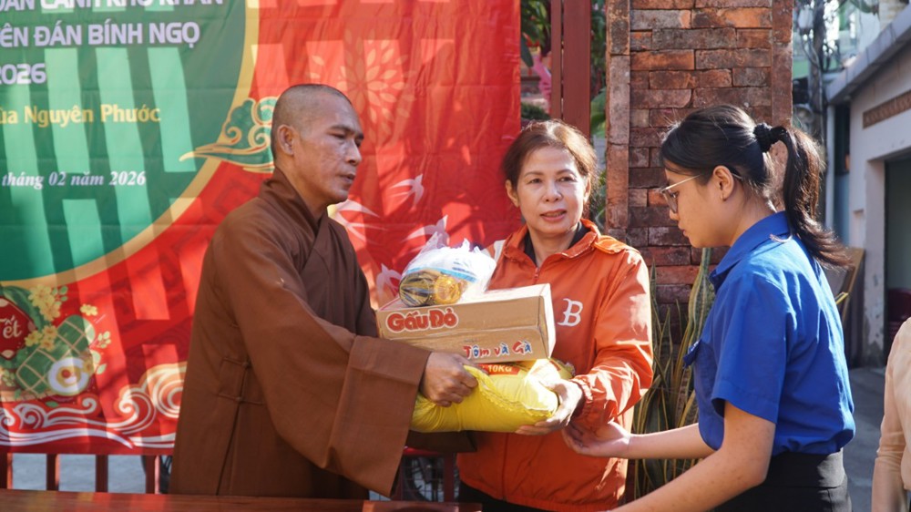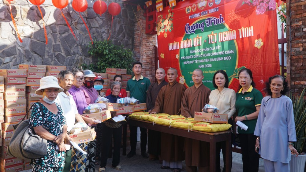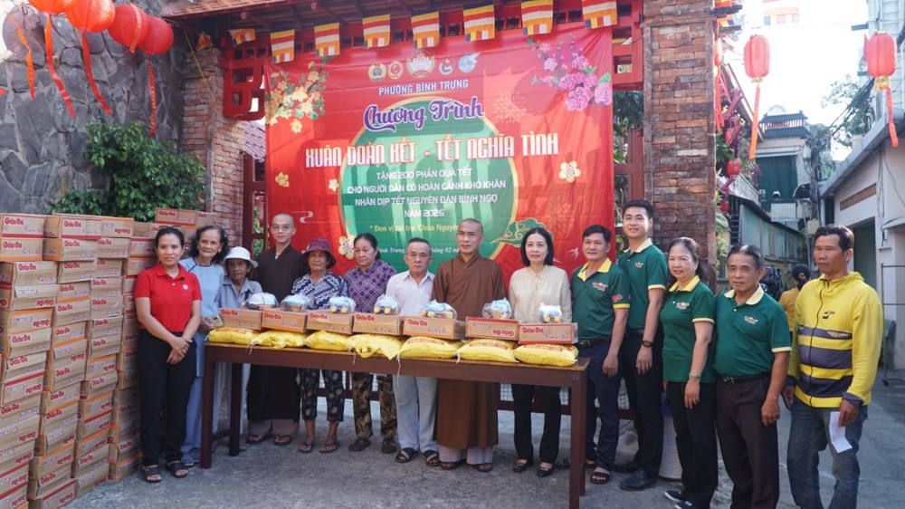 Trong không khí đầm ấm của những ngày giáp Tết Nguyên đán Bính Ngọ, sáng ngày 04/02/2026 (nhằm ngày 17 tháng Chạp năm Ất Tỵ), chùa Nguyên Phước (phường Bình Trưng, TP.HCM) phối hợp cùng Uỷ ban MTTQVN phường Bình Trưng đã tổ chức chương trình “Xuân đoàn kết - Tết nghĩa tình” trao quà hỗ trợ các hộ gia đình có hoàn cảnh khó khăn trên địa bàn.