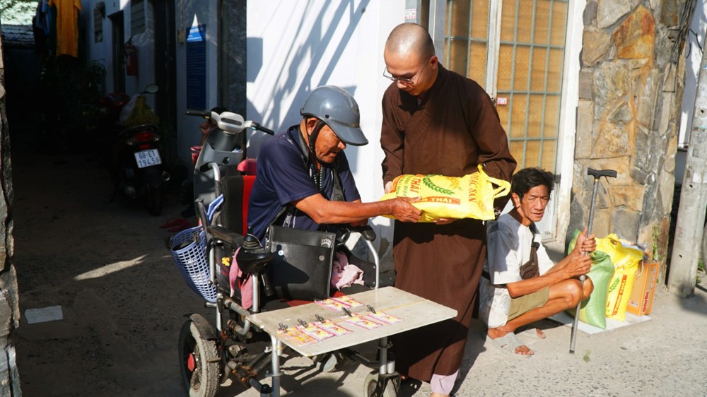Thượng tọa Thích Chúc Từ – Trụ trì chùa Nguyên Phước trao quà Tết cho bà con