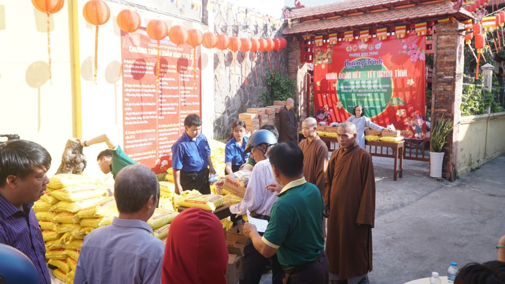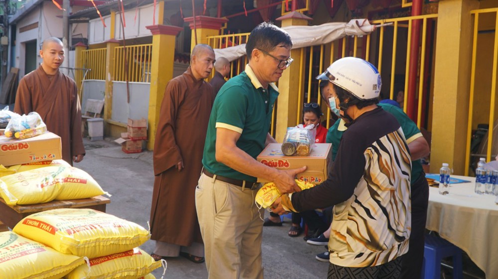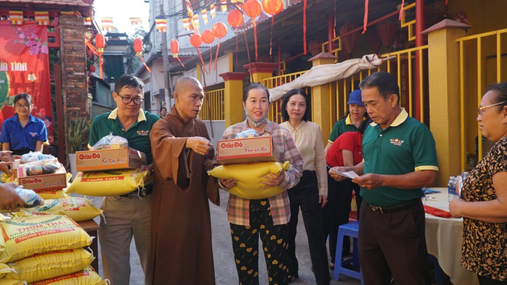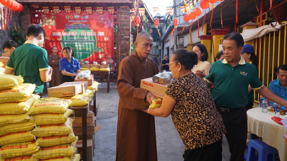 Tại buổi trao quà, Thượng tọa Thích Chúc Từ – Trụ trì chùa Nguyên Phước đã trực tiếp trao 200 phần quà đến tay bà con. Mỗi phần quà trị giá 300.000 đồng, gồm 10kg gạo, 1 thùng mì, 1kg đường, 1 chai nước tương và 1 chai dầu ăn. Đây là những nhu yếu phẩm thiết thực, góp phần hỗ trợ các gia đình ổn định sinh hoạt, góp phần giúp bà con vơi bớt nhọc nhằn, an tâm đón Tết với đủ đầy hơn.