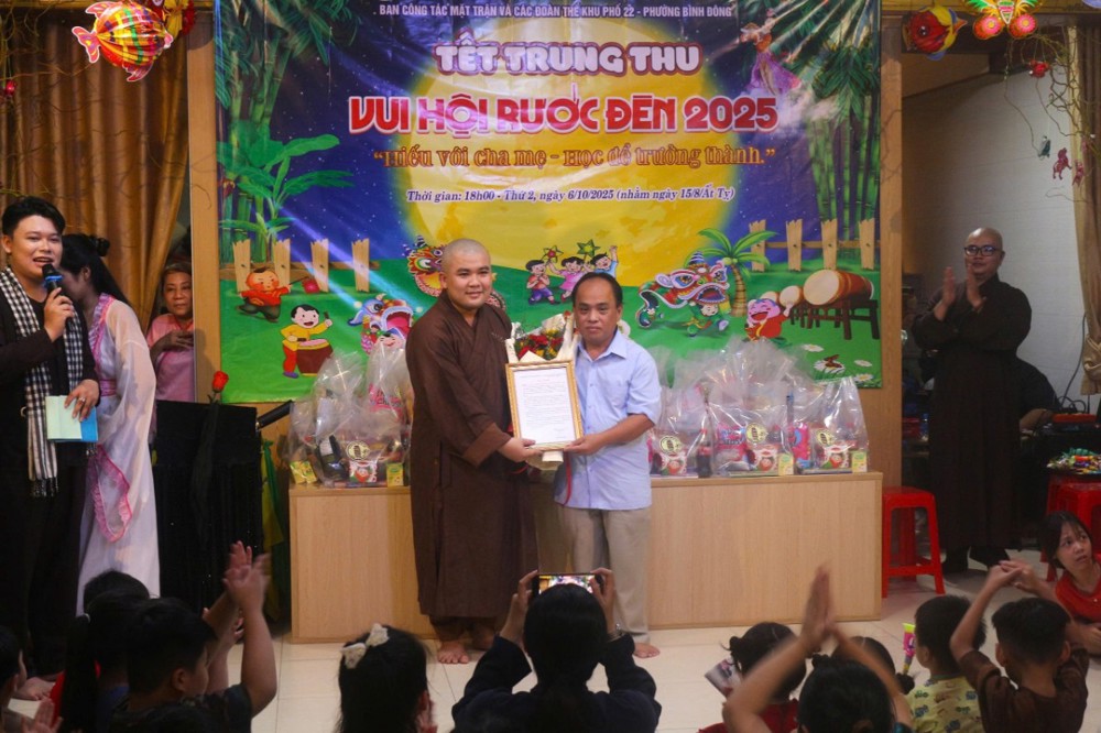 PSO - Tối ngày 6/10/2025 (nhằm ngày 15/8 năm Ất Tỵ), tại chùa Phước Anh, phường Bình Đông, TP.HCM, Đại đức Thích Minh Nhân – Phó trụ trì chùa Phước Anh, cùng chư Tăng và Phật tử đã tổ chức chương trình Tết Trung thu với chủ đề “Vui hội Rước đèn 2025” và “Hiếu với Cha Mẹ - Học để trưởng thành”, nhằm mang đến cho các em thiếu nhi địa phương một mùa Trung thu ấm áp và ý nghĩa.