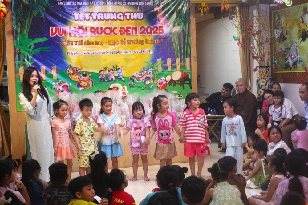 Chương trình có sự phối hợp của lãnh đạo khu phố 22, phường Bình Đông, với nhiều tiết mục văn nghệ đặc sắc như múa lân, giao lưu cùng chị Hằng – chú Cuội, ảo thuật, xổ số tặng quà vui nhộn, rước đèn Trung thu...