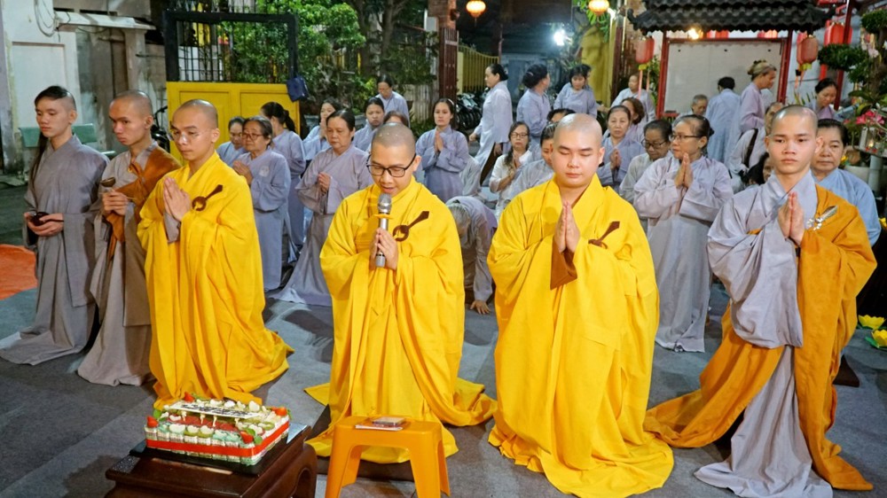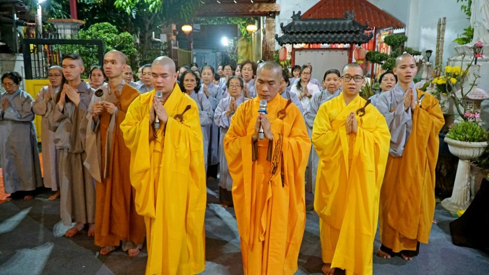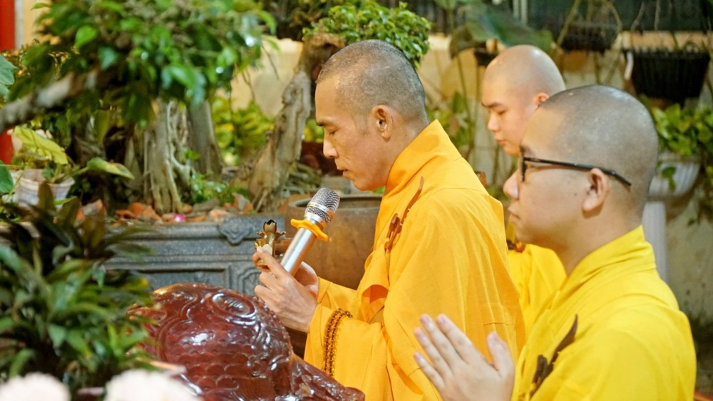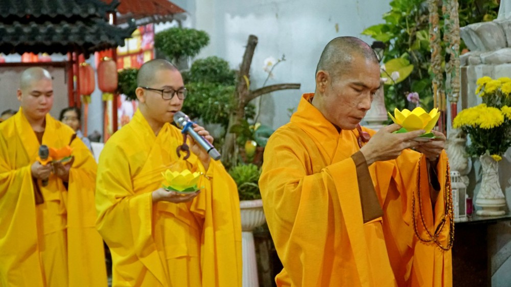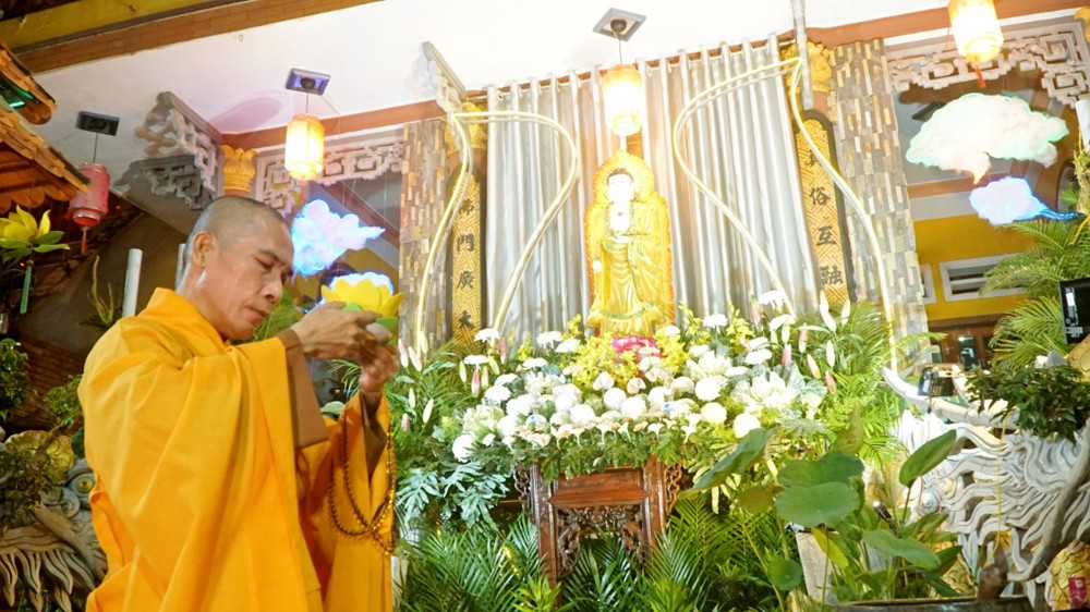 Tiếp đó, Thượng tọa Thích Chúc Từ – Trụ trì chùa Nguyên Phước cùng đại chúng trang nghiêm hướng về tôn tượng Đức Từ Phụ A Di Đà để niêm hương bạch Phật, tụng kinh A Di Đà và đảnh lễ đại nguyện từ bi, cứu độ vô lượng chúng sinh của Ngài.