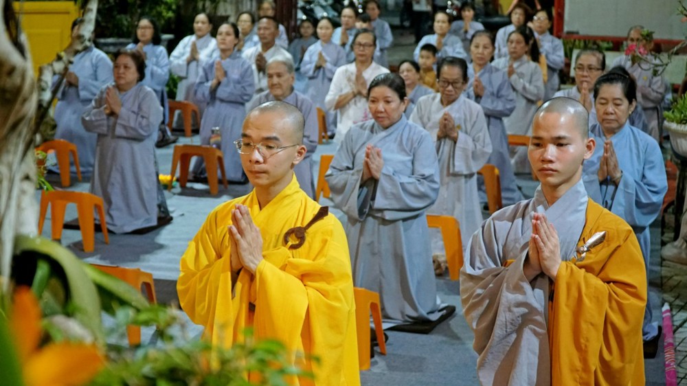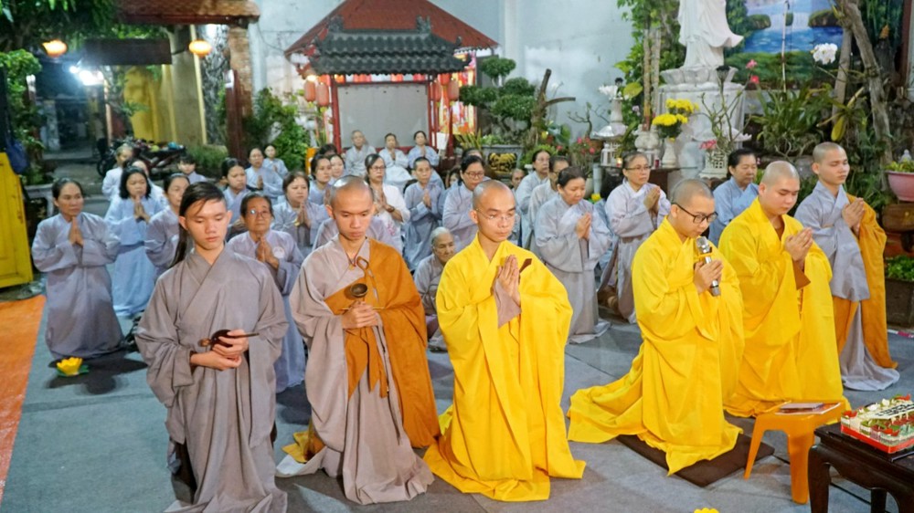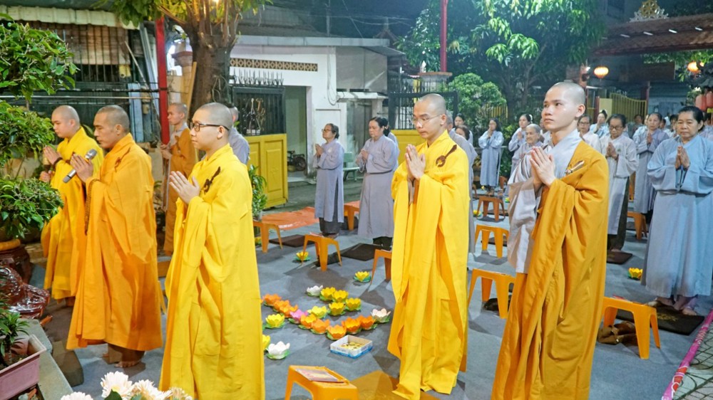 Sau thời khóa tụng kinh, đại chúng trang nghiêm thực hiện nghi thức kinh hành niệm Phật. Trong từng bước chân chậm rãi, an trú chánh niệm, tiếng xưng niệm hồng danh “Nam mô A Di Đà Phật” vang đều, hòa quyện cùng ánh nến lung linh, tạo nên không gian thanh tịnh, nhiệm mầu. Mỗi bước kinh hành là một lần lắng lòng quay về tự thân, mỗi câu niệm Phật là sự bồi đắp niềm tin và nguyện lực, giúp hành giả nhiếp tâm an trú trong hiện tại.