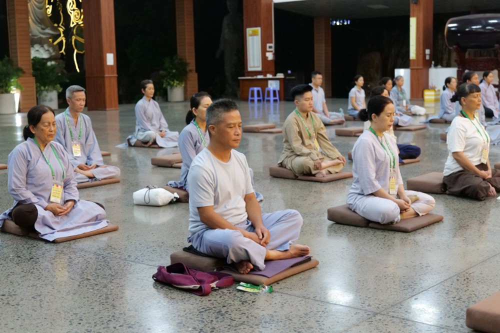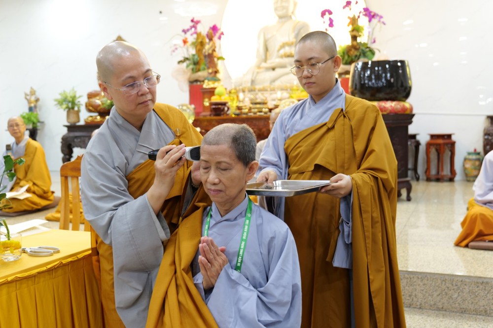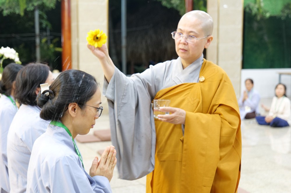 Trong không khí thanh tịnh của thiền đường, đại chúng đồng hướng tâm lễ Phật, phát nguyện giữ gìn oai nghi tế hạnh, tuân thủ nội quy và thời khóa trong suốt mười ngày tu tập. Điểm nhấn của đêm khai mạc là nghi thức cạo tóc xuất gia gieo duyên cho năm hành giả phát tâm, diễn ra trang nghiêm, thể hiện chí nguyện buông xả, bước vào hành trình tu học với tinh thần khiêm cung và kỷ luật. Hình ảnh chư Ni hướng dẫn nghi thức, đại chúng đồng chắp tay nhiếp tâm, giữ sự tĩnh lặng đã góp phần tạo nên không gian trang nghiêm, đúng với ý nghĩa “trở về” trong mùa tu học.
