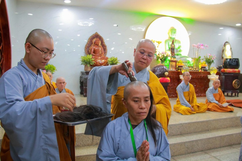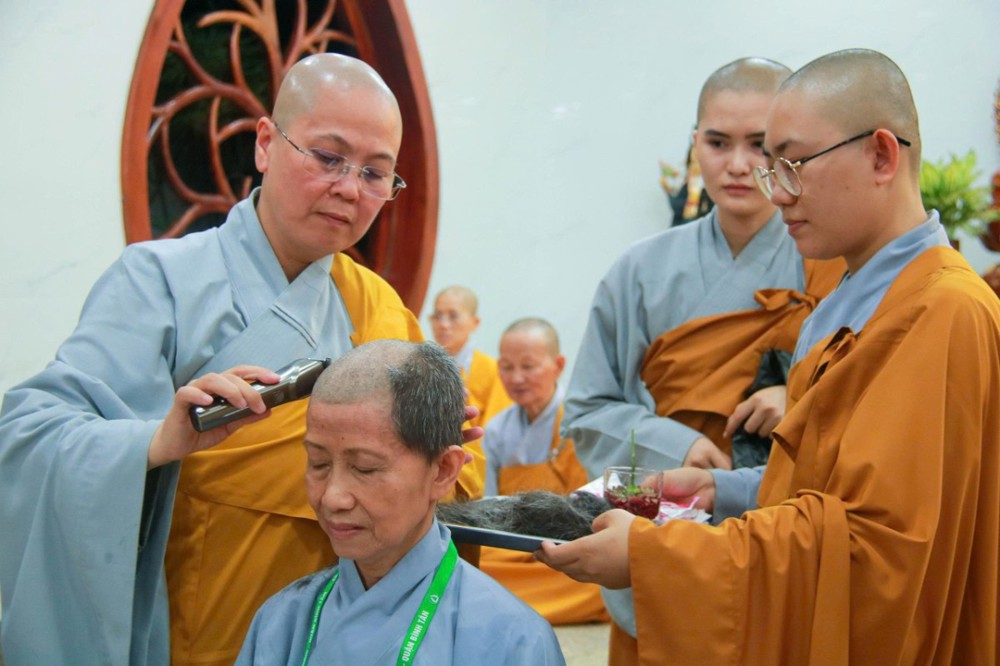 Trong ánh sáng uy nghi của Đức Phật Bổn Sư, Ni sư Thích Nữ Diệu Hiếu trực tiếp cạo bỏ từng lọn tóc cho các giới tử, biểu tượng cho sự dứt trừ nghiệp phàm và buông bỏ trần cấu qua bao kiếp luân hồi. Mỗi đường kéo chạm vào mái tóc là một lần giới tử lặng lẽ đọc thầm đại nguyện: tinh tấn tu tập, sống trong chánh niệm và tiến bước trên con đường giải thoát.