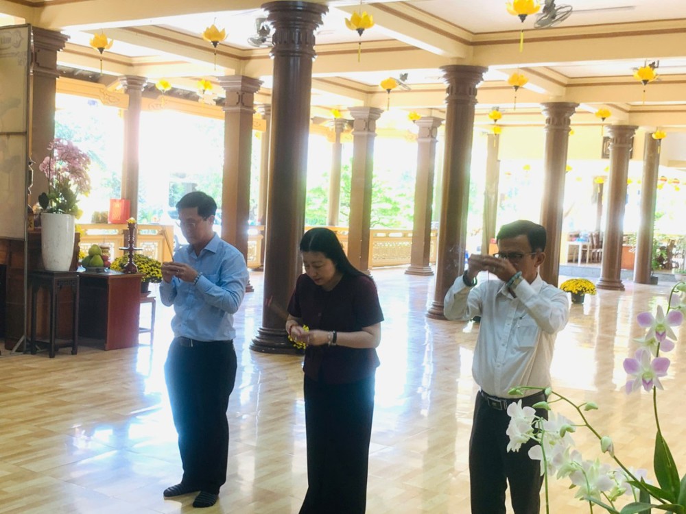 Đoàn do Bà Trương Thanh Nga - Thành Ủy viên, Phó trưởng Ban Tuyên giáo và Dân vận Thành ủy làm trưởng đoàn. Tiếp đoàn có Ni sư Thích nữ Từ Thảo - Ủy viên HĐTS, Phó trưởng Phân ban kiêm Trưởng ban Pháp chế Phân ban Ni giới T.Ư, Phó ban Trị sự kiêm Phó ban Thường trực Ban Kinh tế Tài chánh GHPGVN TP.HCM, Trụ trì Chùa Bồ Đề Đạo Tràng.